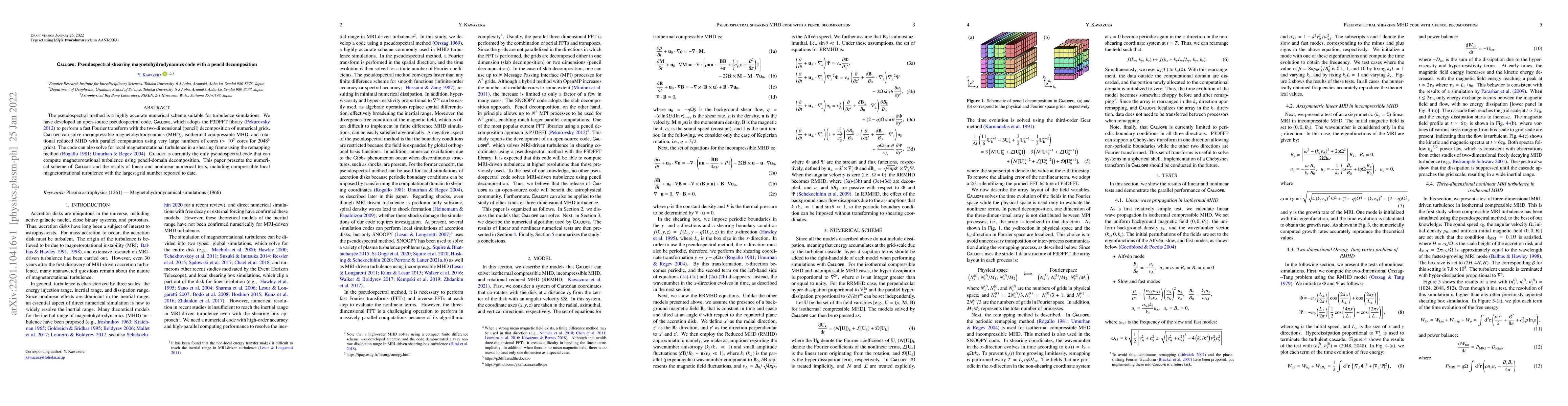 The paper introduces \textsc{\textsf{Calliope}}, an open-source pseudospectral code for simulating magnetohydrodynamics (MHD) using the P3DFFT library for efficient parallel computation. The code can handle large-scale turbulence simulations and is the first to compute magnetorotational turbulence using pencil-domain decomposition.