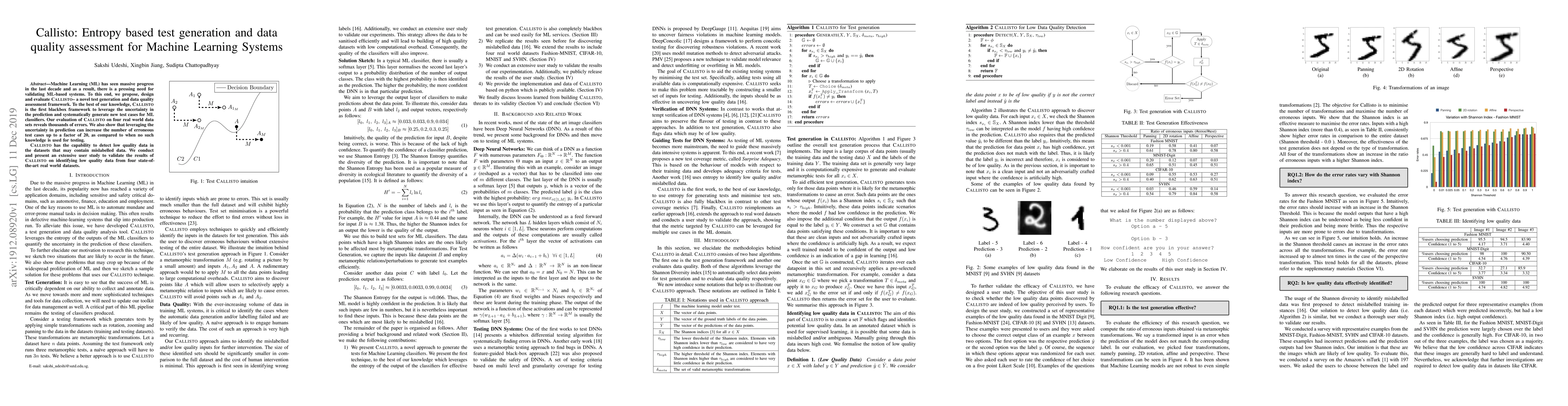 Machine Learning (ML) has seen massive progress in the last decade and as a result, there is a pressing need for validating ML-based systems. To this end, we propose, design and evaluate CALLISTO - a novel test generation and data quality assessment framework. To the best of our knowledge, CALLISTO is the first blackbox framework to leverage the uncertainty in the prediction and systematically generate new test cases for ML classifiers. Our evaluation of CALLISTO on four real world data sets reveals thousands of errors. We also show that leveraging the uncertainty in prediction can increase the number of erroneous test cases up to a factor of 20, as compared to when no such knowledge is used for testing. CALLISTO has the capability to detect low quality data in the datasets that may contain mislabelled data. We conduct and present an extensive user study to validate the results of CALLISTO on identifying low quality data from four state-of-the-art real world datasets.