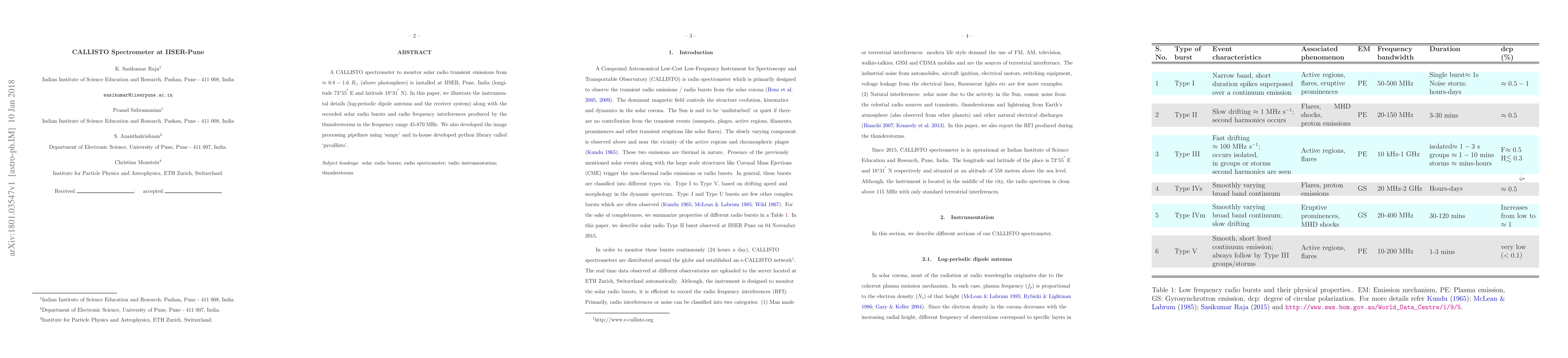 The CALLISTO spectrometer at IISER-Pune monitors solar radio transient emissions, utilizing a log-periodic dipole antenna and receiver system. The instrument records solar radio bursts and interferences from thunderstorms in the 45-870 MHz range, employing `sunpy' and `pycallisto' for image processing.