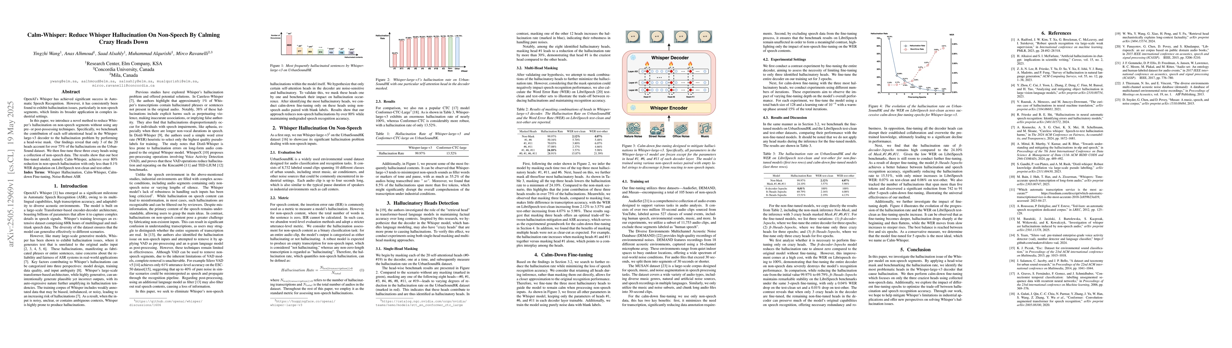 Researchers developed Calm-Whisper to reduce hallucination in speech recognition models like Whisper, achieving 80% reduction without WER degradation. By fine-tuning a subset of self-attentional heads, they improved performance on non-speech segments.