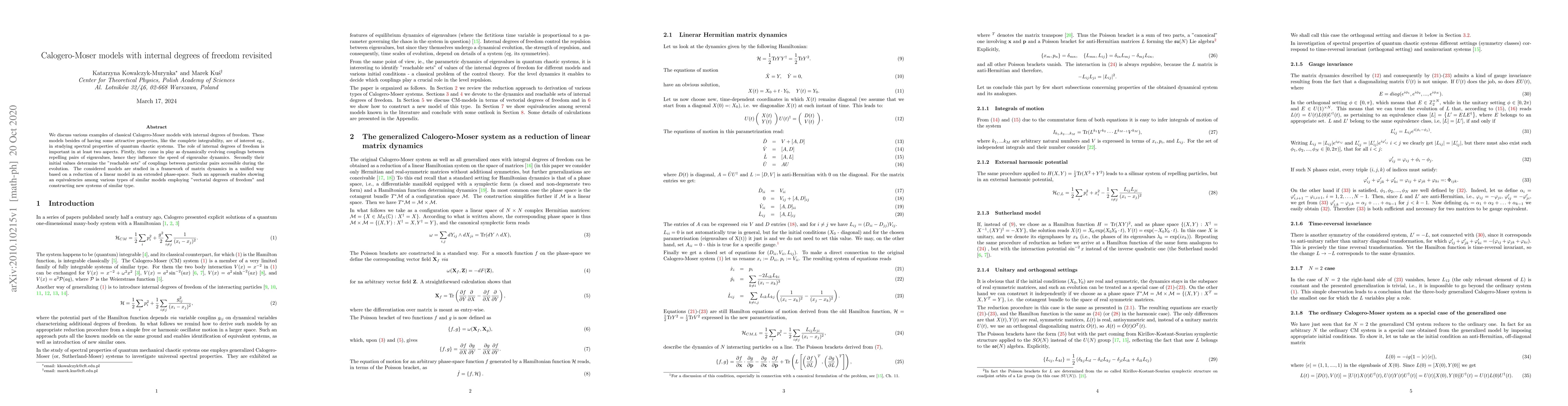 This paper revisits classical Calogero-Moser models with internal degrees of freedom, highlighting their complete integrability and relevance in quantum chaotic systems. It explores how internal degrees of freedom influence eigenvalue dynamics and determine reachable coupling sets, employing a matrix dynamics framework for unified study and model equivalence.