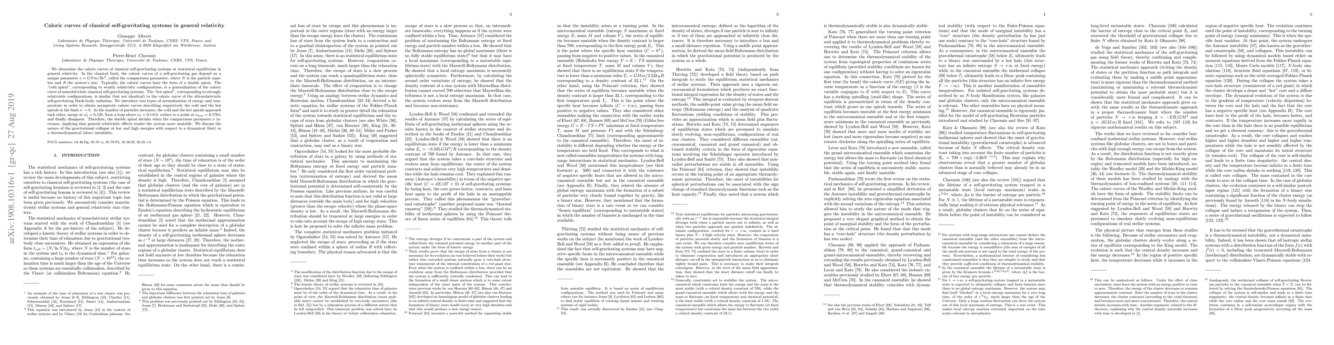 We determine the caloric curves of classical self-gravitating systems at statistical equilibrium in general relativity. In the classical limit, the caloric curves of a self-gravitating gas depend on a unique parameter $\nu=GNm/Rc^2$, called the compactness parameter, where $N$ is the particle number and $R$ the system's size. Typically, the caloric curves have the form of a double spiral. The "cold spiral", corresponding to weakly relativistic configurations, is a generalization of the caloric curve of nonrelativistic classical self-gravitating systems. The "hot spiral'", corresponding to strongly relativistic configurations, is similar (but not identical) to the caloric curve of the ultrarelativistic self-gravitating black-body radiation. We introduce two types of normalization of energy and temperature in order to obtain asymptotic caloric curves describing respectively the cold and the hot spirals in the limit $\nu\rightarrow 0$. As the number of particles increases, the cold and the hot spirals approach each other, merge at $\nu'_S=0.128$, form a loop above $\nu_S=0.1415$, reduce to a point at $\nu_{\rm max}=0.1764$, and finally disappear. Therefore, the double spiral shrinks when the compactness parameter $\nu$ increases, implying that general relativistic effects render the system more unstable. We discuss the nature of the gravitational collapse at low and high energies with respect to a dynamical (fast) or a thermodynamical (slow) instability.