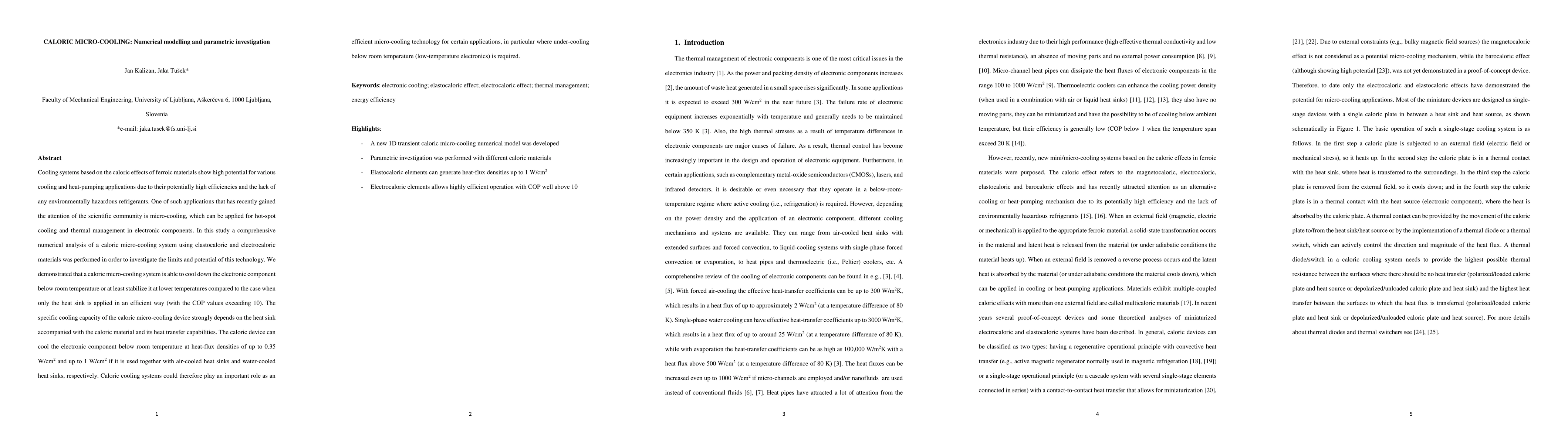 Cooling systems based on the caloric effects of ferroic materials show high potential for various cooling and heat-pumping applications due to their potentially high efficiencies and the lack of any environmentally hazardous refrigerants. One of such applications that has recently gained the attention of the scientific community is micro-cooling, which can be applied for hot-spot cooling and thermal management in electronic components. In this study a comprehensive numerical analysis of a caloric micro-cooling system using elastocaloric and electrocaloric materials was performed in order to investigate the limits and potential of this technology. We demonstrated that a caloric micro-cooling system is able to cool down the electronic component below room temperature or at least stabilize it at lower temperatures compared to the case when only the heat sink is applied in an efficient way (with the COP values exceeding 10). The specific cooling capacity of the caloric micro-cooling device strongly depends on the heat sink accompanied with the caloric material and its heat transfer capabilities. The caloric device can cool the electronic component below room temperature at heat-flux densities of up to 0.35 W/cm2 and up to 1 W/cm2 if it is used together with air-cooled heat sinks and water-cooled heat sinks, respectively. Caloric cooling systems could therefore play an important role as an efficient micro-cooling technology for certain applications, in particular where under-cooling below room temperature (low-temperature electronics) is required.