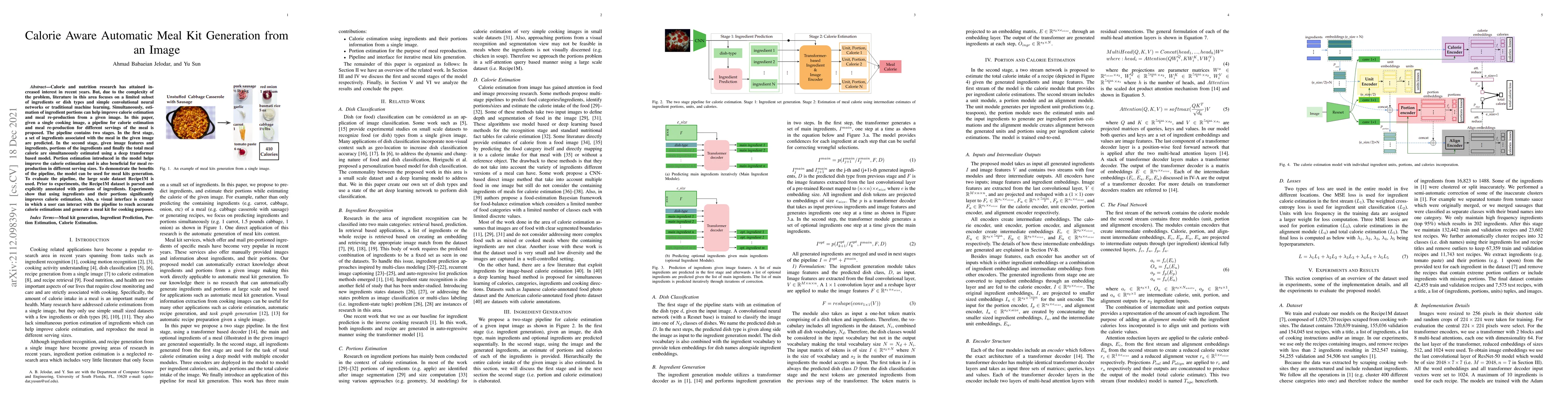 Calorie and nutrition research has attained increased interest in recent years. But, due to the complexity of the problem, literature in this area focuses on a limited subset of ingredients or dish types and simple convolutional neural networks or traditional machine learning. Simultaneously, estimation of ingredient portions can help improve calorie estimation and meal re-production from a given image. In this paper, given a single cooking image, a pipeline for calorie estimation and meal re-production for different servings of the meal is proposed. The pipeline contains two stages. In the first stage, a set of ingredients associated with the meal in the given image are predicted. In the second stage, given image features and ingredients, portions of the ingredients and finally the total meal calorie are simultaneously estimated using a deep transformer-based model. Portion estimation introduced in the model helps improve calorie estimation and is also beneficial for meal re-production in different serving sizes. To demonstrate the benefits of the pipeline, the model can be used for meal kits generation. To evaluate the pipeline, the large scale dataset Recipe1M is used. Prior to experiments, the Recipe1M dataset is parsed and explicitly annotated with portions of ingredients. Experiments show that using ingredients and their portions significantly improves calorie estimation. Also, a visual interface is created in which a user can interact with the pipeline to reach accurate calorie estimations and generate a meal kit for cooking purposes.