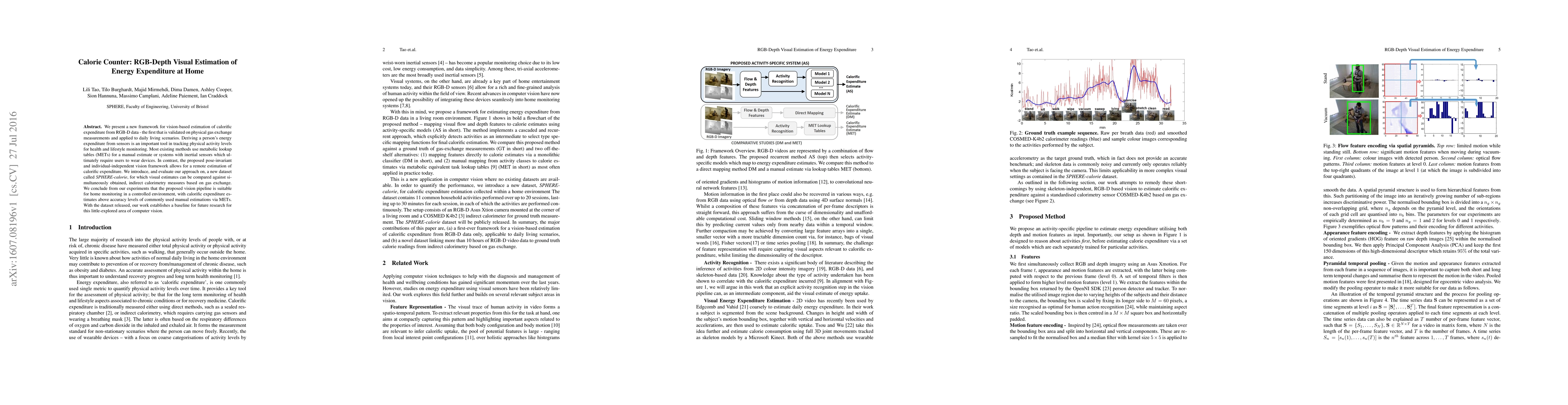 This paper introduces a vision-based framework for estimating energy expenditure from RGB-D data, validated against gas exchange measurements, offering a pose-invariant and device-free alternative to existing methods. The proposed method, evaluated on a new dataset SPHERE-calorie, shows higher accuracy than manual MET estimates, establishing a baseline for future research in computer vision for health monitoring.