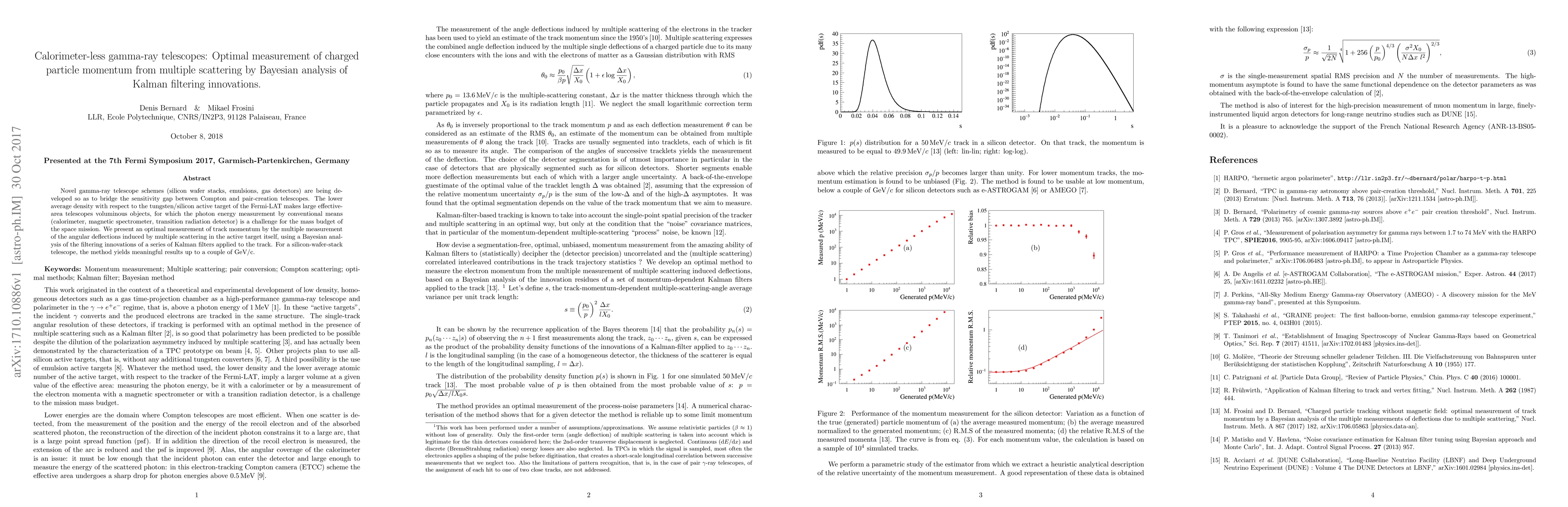 Researchers developed a new method to measure charged particle momentum in gamma-ray telescopes without using traditional calorimeters. This approach uses Kalman filtering to analyze the angular deflections caused by multiple scattering within the telescope's active target.