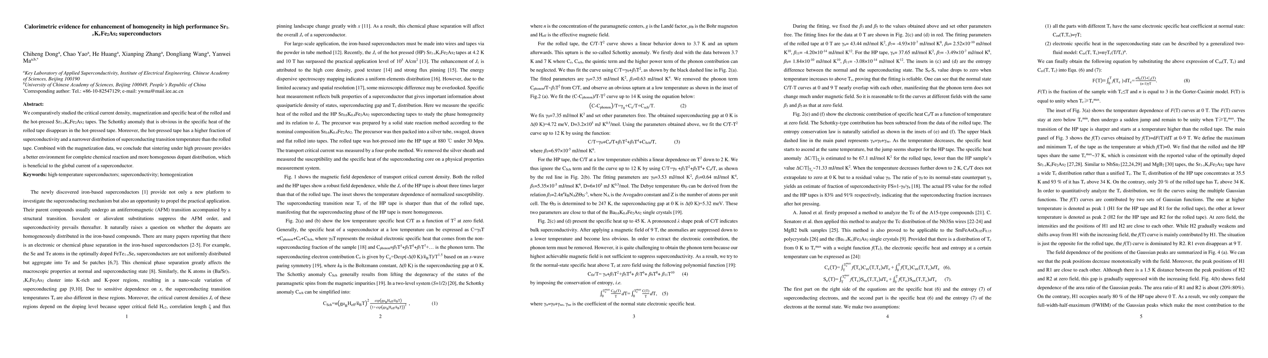 We comparatively studied the critical current density, magnetization and specific heat of the rolled and the hot-pressed Sr1-xKxFe2As2 tapes. The Schottky anomaly that is obvious in the specific heat of the rolled tape disappears in the hot-pressed tape. Moreover, the hot-pressed tape has a higher fraction of superconductivity and a narrower distribution of superconducting transition temperature than the rolled tape. Combined with the magnetization data, we conclude that sintering under high pressure provides a better environment for complete chemical reaction and more homogenous dopant distribution, which is beneficial to the global current of a superconductor.