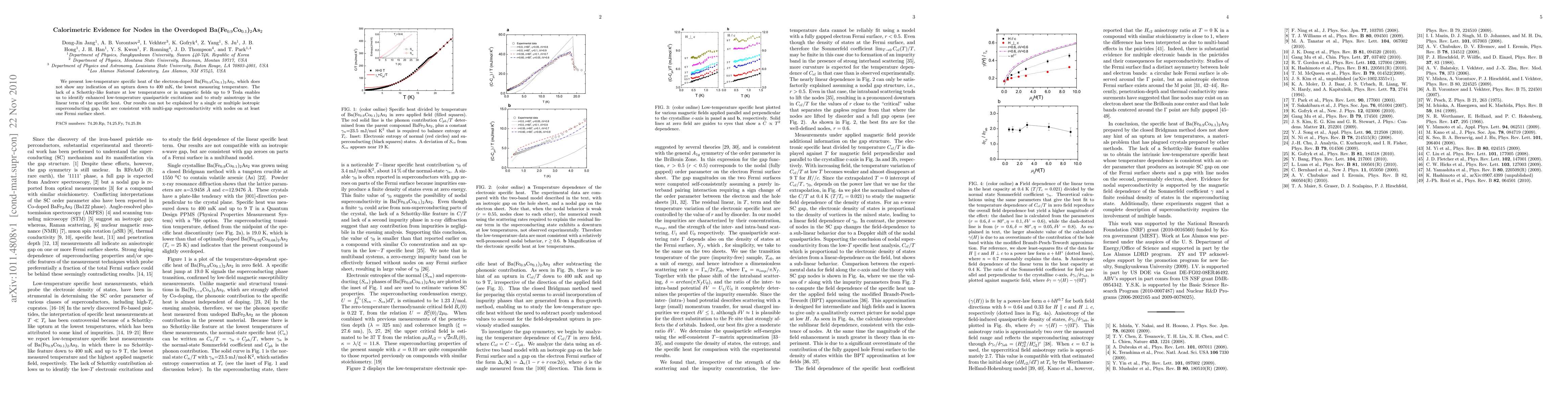 We present low-temperature specific heat of the electron-doped Ba(Fe$_{0.9}$Co$_{0.1}$)$_{2}$As$_{2}$, which does not show any indication of an upturn down to 400 mK, the lowest measuring temperature. The lack of a Schottky-like feature at low temperatures or in magnetic fields up to 9 Tesla enables us to identify enhanced low-temperature quasiparticle excitations and to study anisotropy in the linear term of the specific heat. Our results can not be explained by a single or multiple isotropic superconducting gap, but are consistent with multi-gap superconductivity with nodes on at least one Fermi surface sheet.