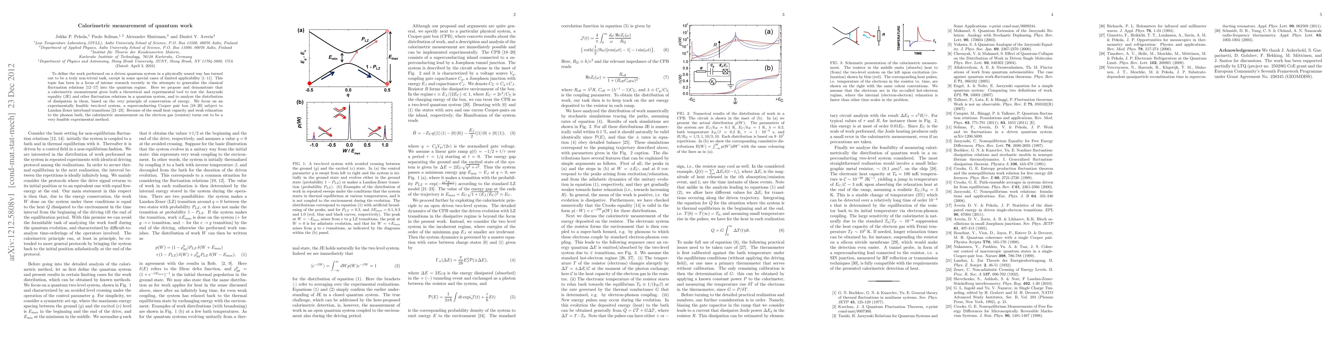 To define the work performed on a driven quantum system in a physically sound way has turned out to be a truly non-trivial task, except in some special cases of limited applicability. This topic has been in a focus of intense research recently in the attempts to generalize the classical fluctuation relations into the quantum regime. Here we propose and demonstrate that a calorimetric measurement gives both a theoretical and experimental tool to test the Jarzynski equality (JE) and other fluctuation relations in a quantum system, and to analyze the distribution of dissipation in them, based on the very principle of conservation of energy. We focus on an experimentally feasible two-level system, a superconducting Cooper pair box subject to Landau-Zener interband transitions. Because of the small heat capacity and weak relaxation to the phonon bath, the calorimetric measurement on the electron gas (resistor) turns out to be a very feasible experimental method.