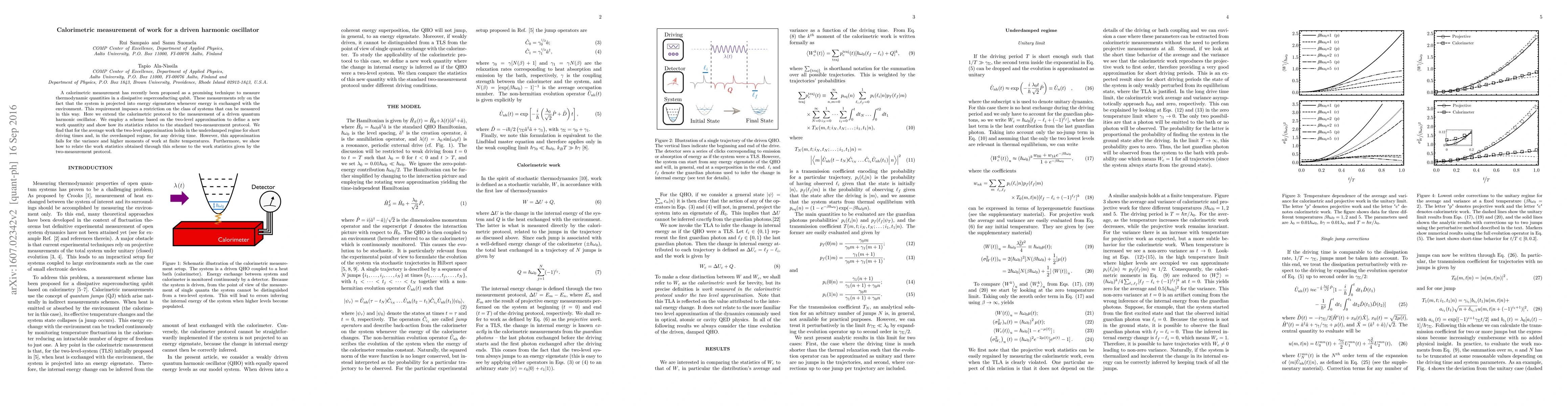 This paper extends a calorimetric protocol to measure thermodynamic quantities in a driven quantum harmonic oscillator, defining a new work quantity and comparing its statistics to the standard two-measurement protocol. The two-level approximation holds for average work in specific regimes but fails for variance and higher moments at finite temperatures.