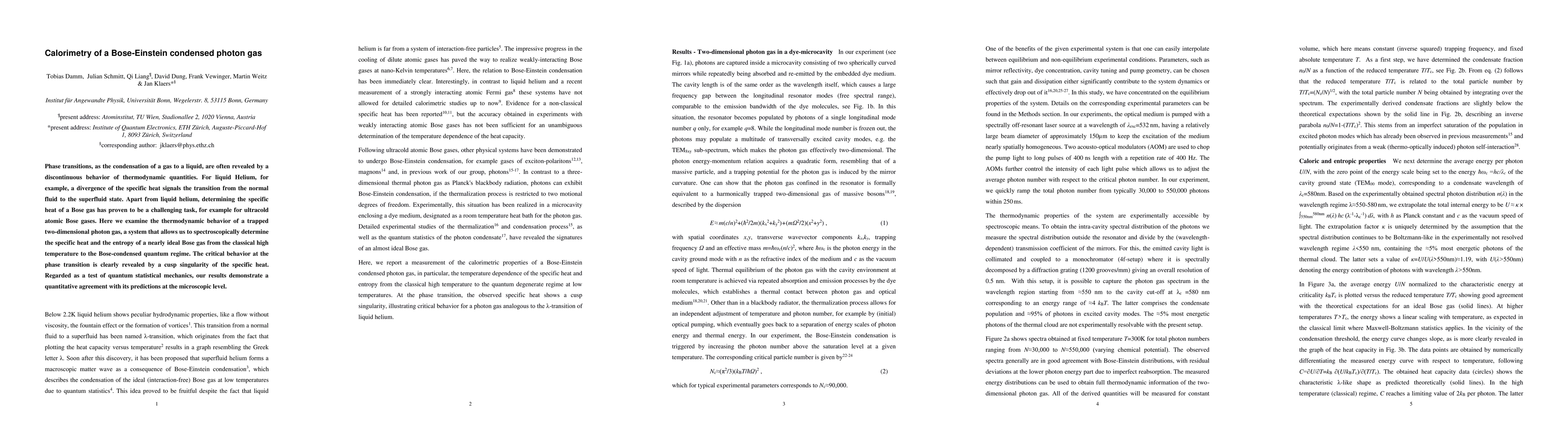 This paper investigates the thermodynamic behavior of a trapped two-dimensional photon gas, determining its specific heat and entropy across classical and quantum regimes. The study reveals a cusp singularity in the specific heat at the phase transition, confirming predictions of quantum statistical mechanics.