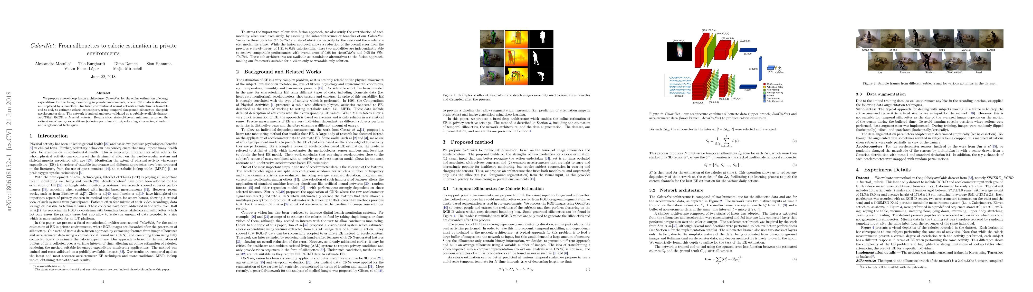 CaloriNet is a novel deep fusion architecture that estimates energy expenditure using temporal silhouettes and accelerometer data, achieving state-of-the-art accuracy in calorie estimation in private environments without relying on RGB data. The end-to-end trainable network outperforms alternative methods for free-living monitoring.