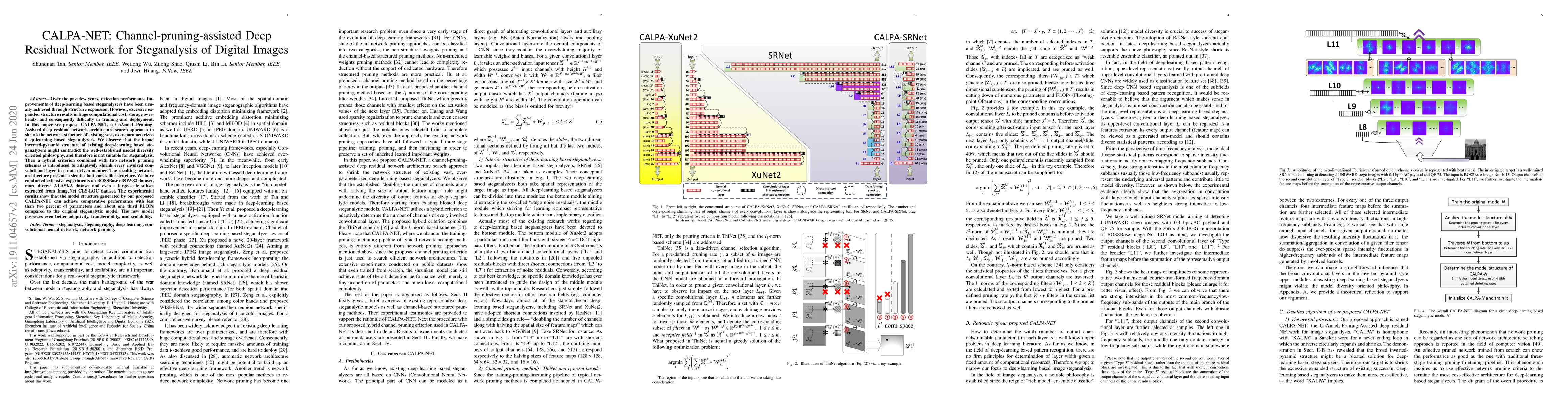 Over the past few years, detection performance improvements of deep-learning based steganalyzers have been usually achieved through structure expansion. However, excessive expanded structure results in huge computational cost, storage overheads, and consequently difficulty in training and deployment. In this paper we propose CALPA-NET, a ChAnneL-Pruning-Assisted deep residual network architecture search approach to shrink the network structure of existing vast, over-parameterized deep-learning based steganalyzers. We observe that the broad inverted-pyramid structure of existing deep-learning based steganalyzers might contradict the well-established model diversity oriented philosophy, and therefore is not suitable for steganalysis. Then a hybrid criterion combined with two network pruning schemes is introduced to adaptively shrink every involved convolutional layer in a data-driven manner. The resulting network architecture presents a slender bottleneck-like structure. We have conducted extensive experiments on BOSSBase+BOWS2 dataset, more diverse ALASKA dataset and even a large-scale subset extracted from ImageNet CLS-LOC dataset. The experimental results show that the model structure generated by our proposed CALPA-NET can achieve comparative performance with less than two percent of parameters and about one third FLOPs compared to the original steganalytic model. The new model possesses even better adaptivity, transferability, and scalability.