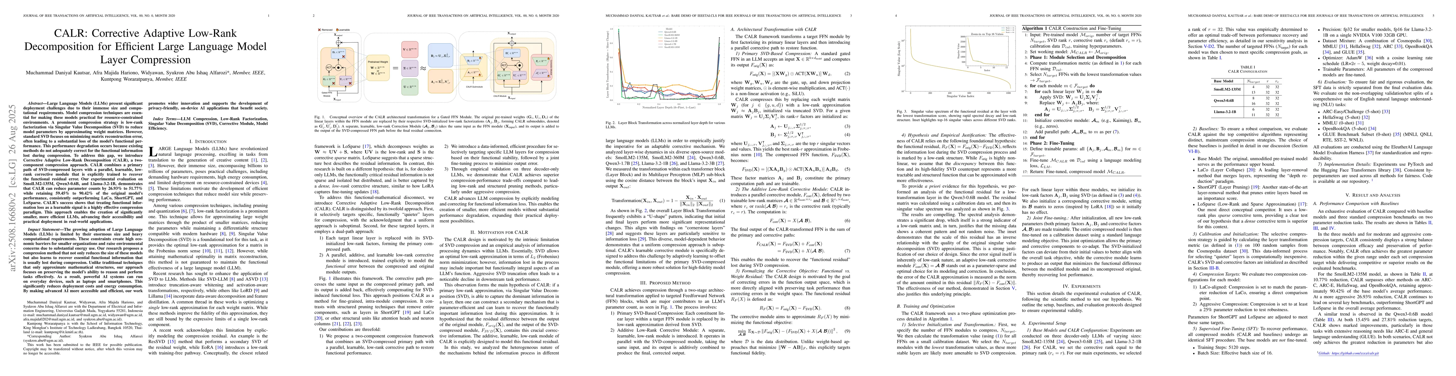 Large Language Models (LLMs) present significant deployment challenges due to their immense size and computational requirements. Model compression techniques are essential for making these models practical for resource-constrained environments. A prominent compression strategy is low-rank factorization via Singular Value Decomposition (SVD) to reduce model parameters by approximating weight matrices. However, standard SVD focuses on minimizing matrix reconstruction error, often leading to a substantial loss of the model's functional performance. This performance degradation occurs because existing methods do not adequately correct for the functional information lost during compression. To address this gap, we introduce Corrective Adaptive Low-Rank Decomposition (CALR), a two-component compression approach. CALR combines a primary path of SVD-compressed layers with a parallel, learnable, low-rank corrective module that is explicitly trained to recover the functional residual error. Our experimental evaluation on SmolLM2-135M, Qwen3-0.6B, and Llama-3.2-1B, demonstrates that CALR can reduce parameter counts by 26.93% to 51.77% while retaining 59.45% to 90.42% of the original model's performance, consistently outperforming LaCo, ShortGPT, and LoSparse. CALR's success shows that treating functional information loss as a learnable signal is a highly effective compression paradigm. This approach enables the creation of significantly smaller, more efficient LLMs, advancing their accessibility and practical deployment in real-world applications.