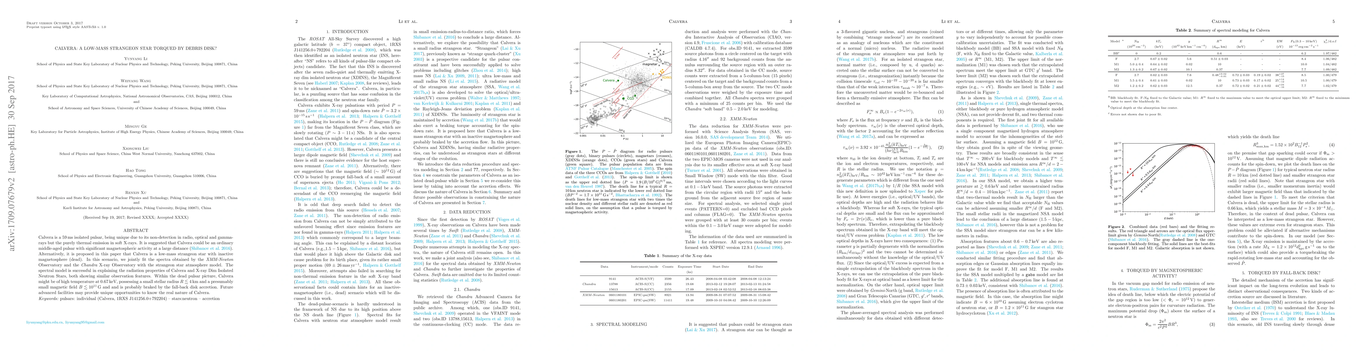 Calvera, a $59\,\mathrm{ms}$ isolated pulsar, exhibits purely thermal X-ray emission without radio, optical, or gamma-ray detections. This paper proposes Calvera could be a low-mass strangeon star with a dead magnetosphere, potentially braked by debris disk accretion, based on spectral fits from XMM-Newton and Chandra observations.