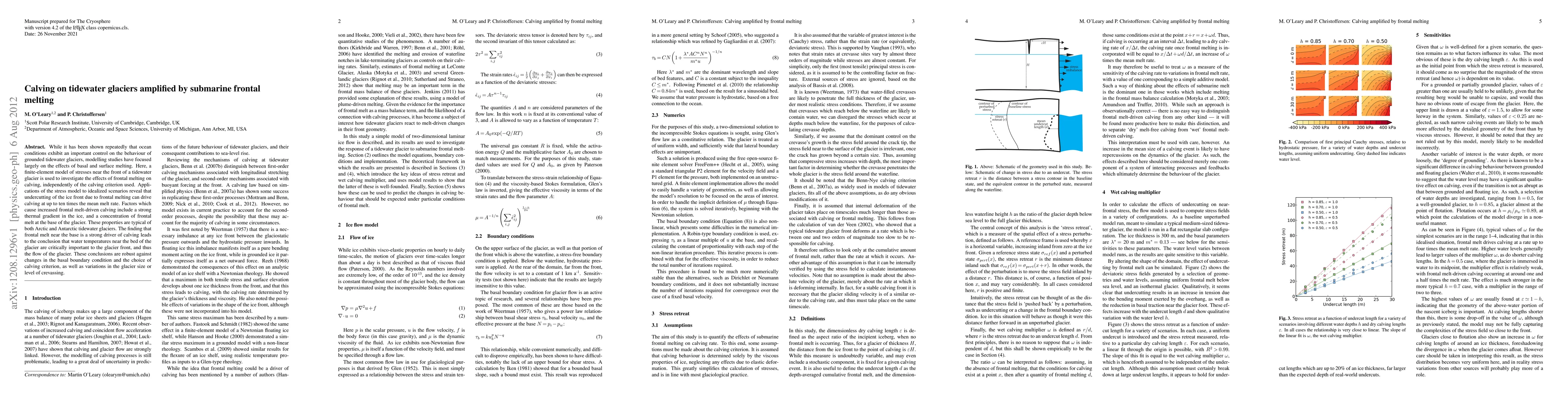 This study uses a finite-element model to demonstrate that submarine frontal melting significantly amplifies calving on tidewater glaciers, often up to ten times the mean melt rate, driven by factors like strong thermal gradients and concentrated melt at the glacier base. These findings highlight the critical role of water temperatures near the glacier bed in influencing glacier dynamics.