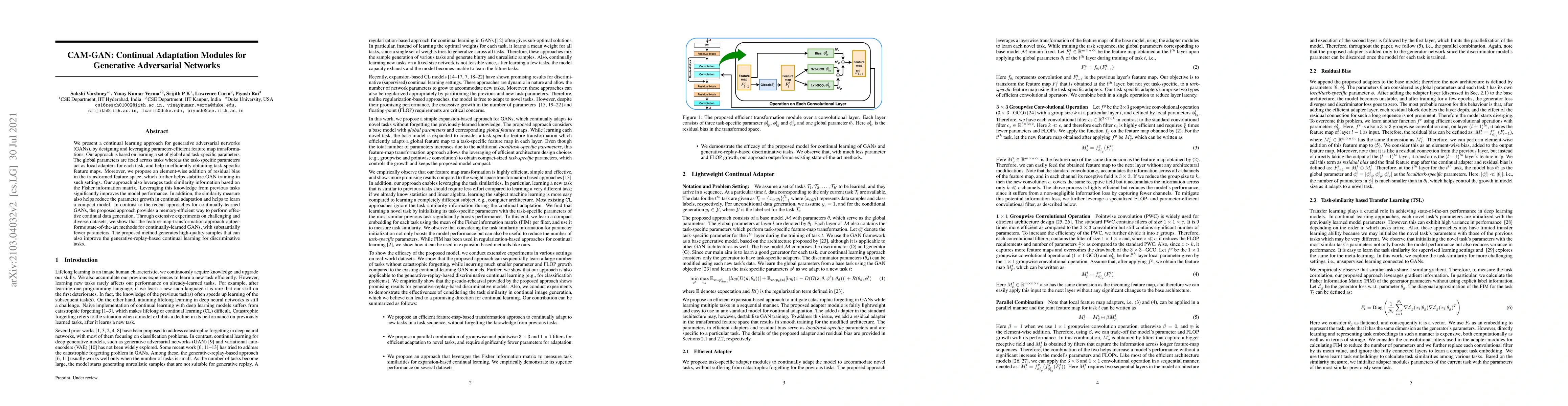 CAM-GAN introduces a continual learning approach for GANs using parameter-efficient feature map transformations with global and task-specific parameters, achieving memory efficiency and high-quality sample generation. The method leverages task similarity and residual bias addition to stabilize training and improve performance.