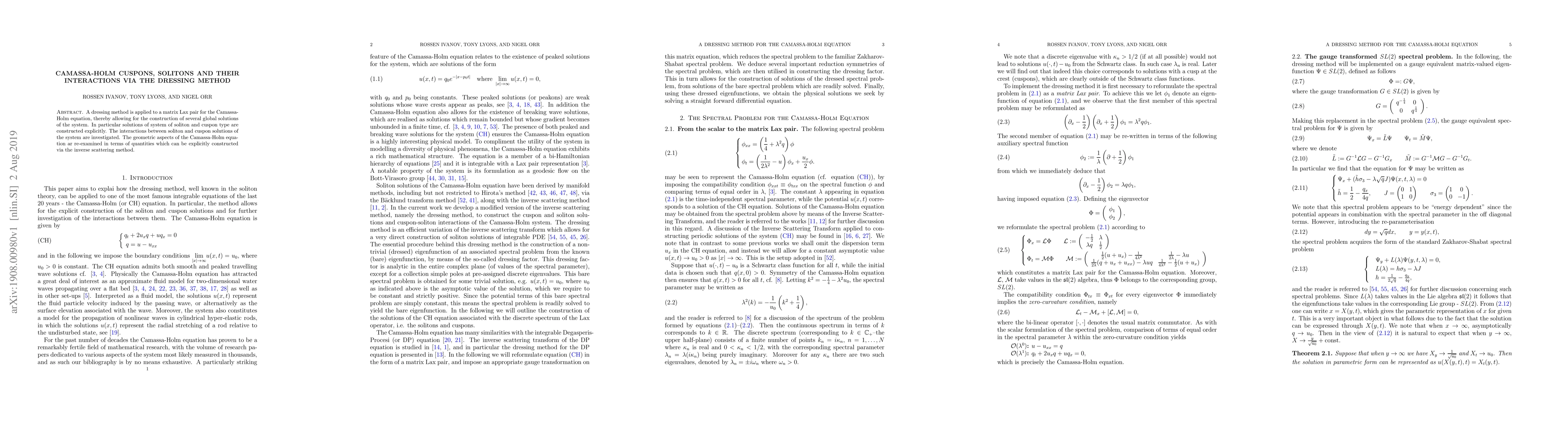 A dressing method is applied to a matrix Lax pair for the Camassa-Holm equation, thereby allowing for the construction of several global solutions of the system. In particular solutions of system of soliton and cuspon type are constructed explicitly. The interactions between soliton and cuspon solutions of the system are investigated. The geometric aspects of the Camassa-Holm equation ar re-examined in terms of quantities which can be explicitly constructed via the inverse scattering method.