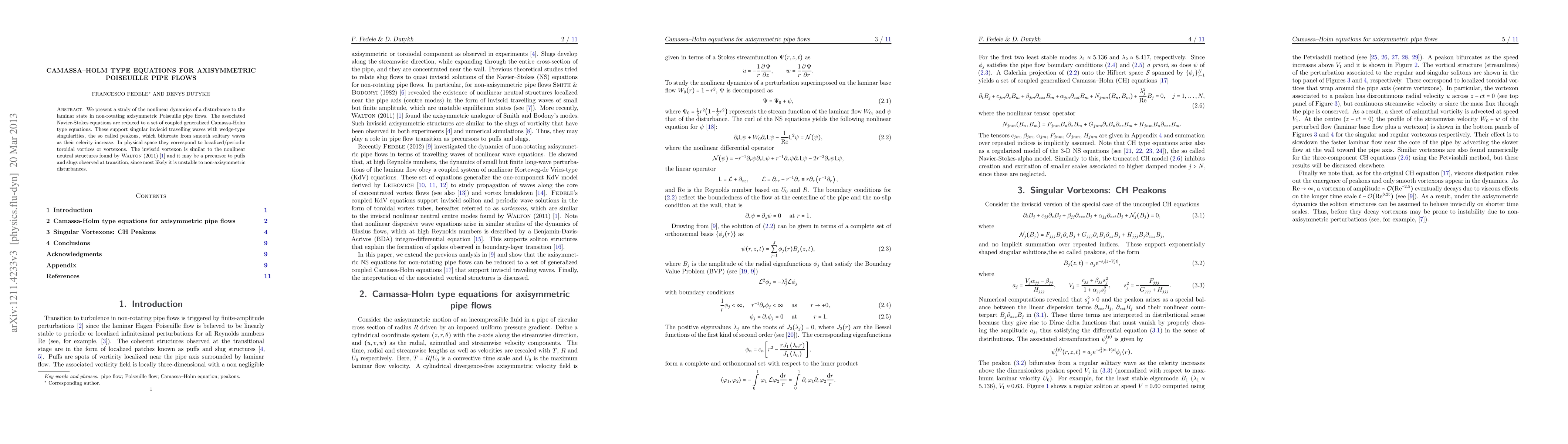 We present a study on the nonlinear dynamics of a disturbance to the laminar state in non-rotating axisymmetric Poiseuille pipe flows. The associated Navier-Stokes equations are reduced to a set of coupled generalized Camassa-Holm type equations. These support singular inviscid travelling waves with wedge-type singularities, the so called peakons, which bifurcate from smooth solitary waves as their celerity increase. In physical space they correspond to localized toroidal vortices or vortexons. The inviscid vortexon is similar to the nonlinear neutral structures found by Walton (2011) and it may be a precursor to puffs and slugs observed at transition, since most likely it is unstable to non-axisymmetric disturbances.