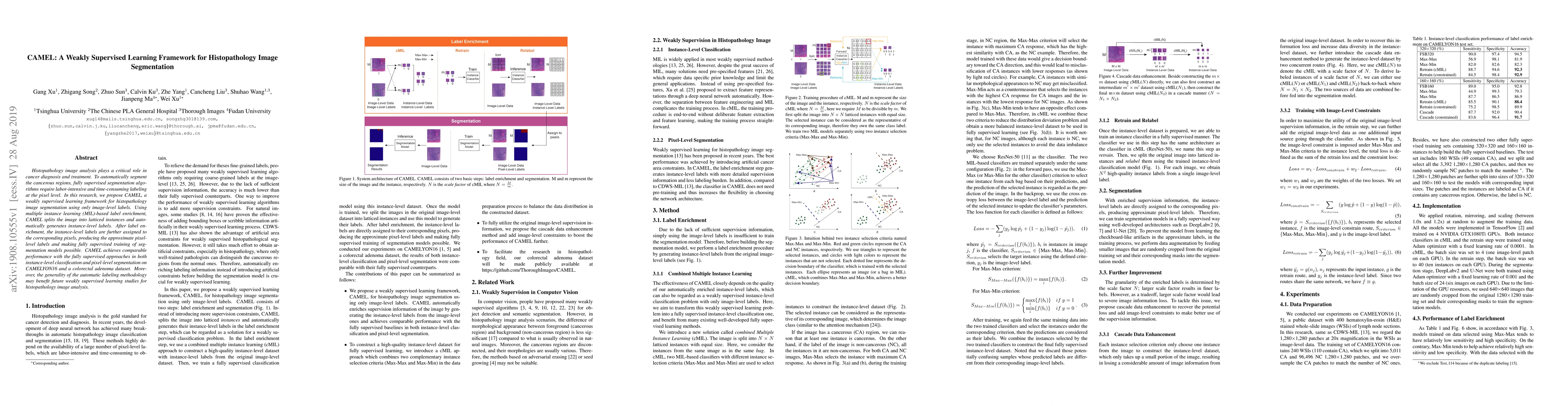 CAMEL is a weakly supervised learning framework for histopathology image segmentation that uses only image-level labels, achieving comparable performance to fully supervised methods. It employs multiple instance learning to generate instance-level labels, which are then refined to produce approximate pixel-level labels.