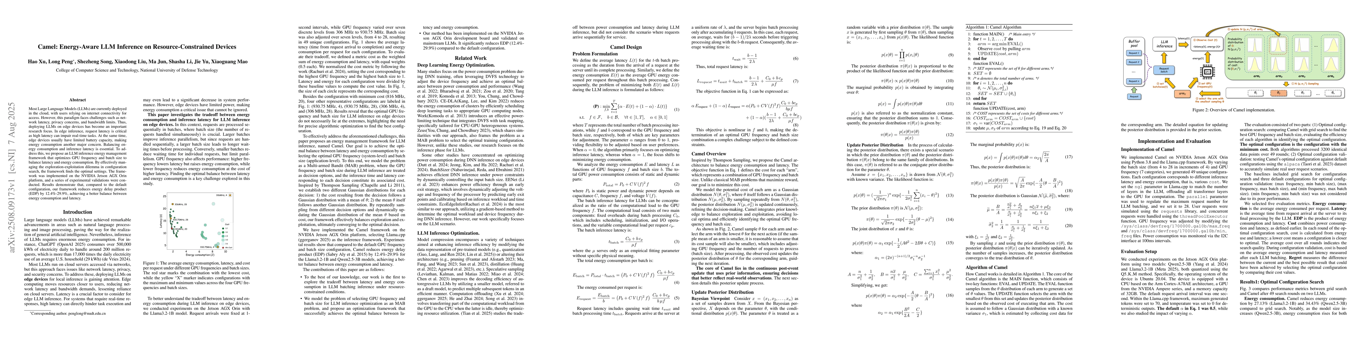 The paper proposes Camel, an energy-aware LLM inference framework that optimizes GPU frequency and batch size to balance latency and energy consumption on resource-constrained devices, implemented on NVIDIA Jetson AGX Orin.
