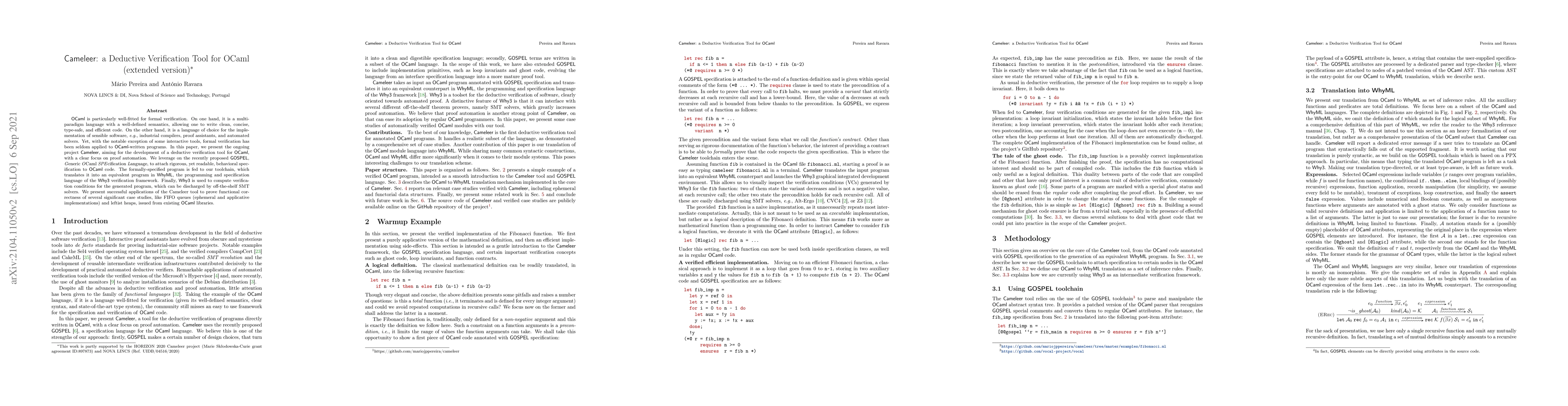 Cameleer is a deductive verification tool for OCaml that automates proof processes using the GOSPEL language to attach behavioral specifications to OCaml code, translating it into WhyML for verification within the Why3 framework, and successfully proving correctness of case studies like FIFO queues and leftist heaps.