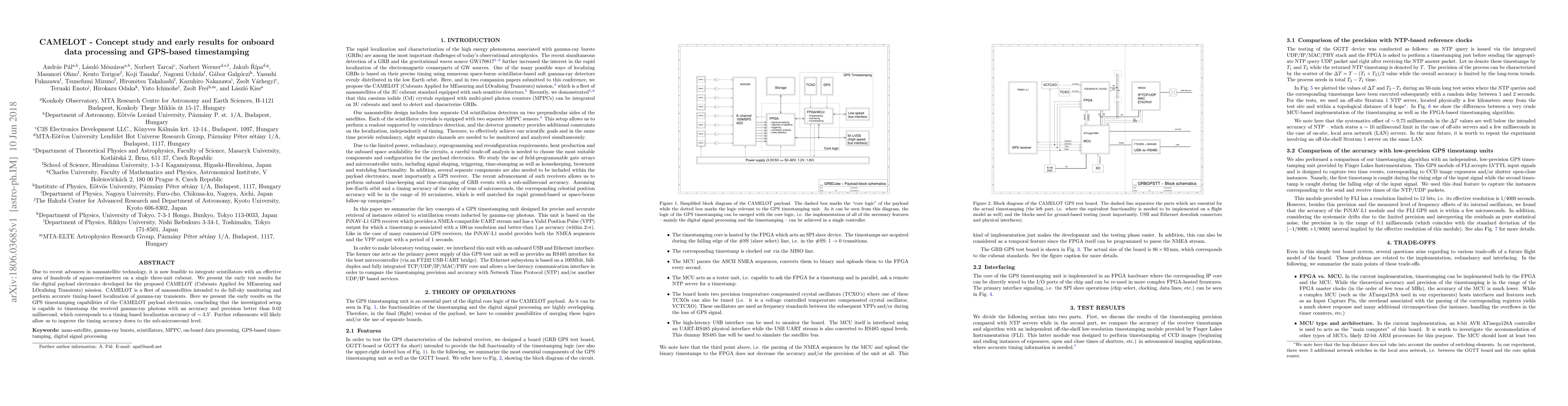 Due to recent advances in nanosatellite technology, it is now feasible to integrate scintillators with an effective area of hundreds of square-centimeters on a single three-unit cubesat. We present the early test results for the digital payload electronics developed for the proposed CAMELOT (Cubesats Applied for MEasuring and LOcalising Transients) mission. CAMELOT is a fleet of nanosatellites intended to do full-sky monitoring and perform accurate timing-based localization of gamma-ray transients. Here we present the early results on the GPS timestamping capabilities of the CAMELOT payload electronics, concluding that the investigated setup is capable to timestamp the received gamma-ray photons with an accuracy and precision better than 0.02 millisecond, which corresponds to a timing based localization accuracy of $\sim 3.5^{\prime}$. Further refinements will likely allow us to improve the timing accuracy down to the sub-microsecond level.