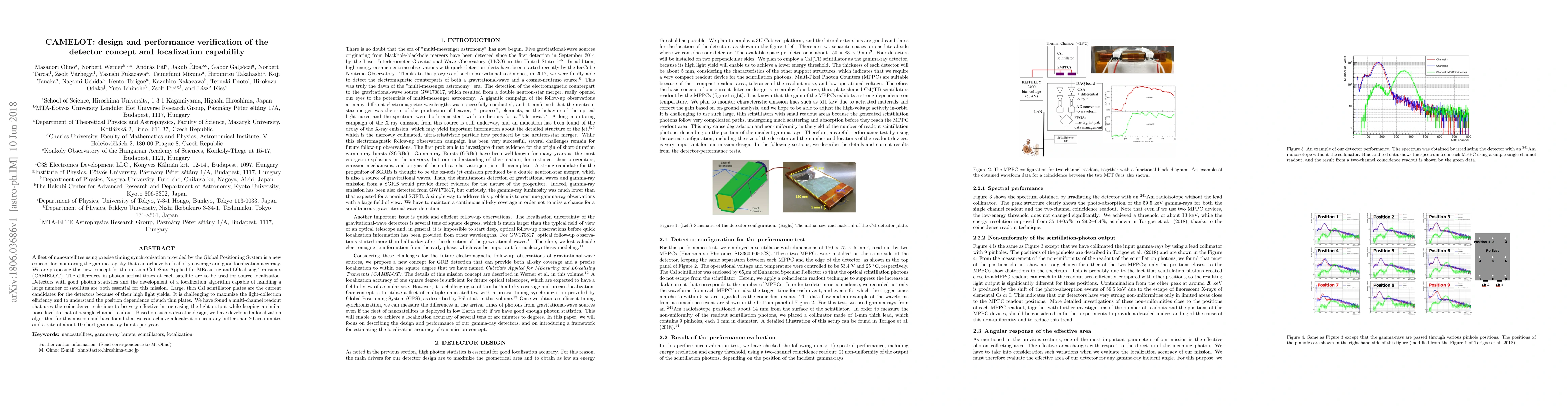 A fleet of nanosatellites using precise timing synchronization provided by the Global Positioning System is a new concept for monitoring the gamma-ray sky that can achieve both all-sky coverage and good localization accuracy. We are proposing this new concept for the mission CubeSats Applied for MEasuring and LOcalising Transients (CAMELOT). The differences in photon arrival times at each satellite are to be used for source localization. Detectors with good photon statistics and the development of a localization algorithm capable of handling a large number of satellites are both essential for this mission. Large, thin CsI scintillator plates are the current candidates for the detectors because of their high light yields. It is challenging to maximize the light-collection efficiency and to understand the position dependence of such thin plates. We have found a multi-channel readout that uses the coincidence technique to be very effective in increasing the light output while keeping a similar noise level to that of a single channel readout. Based on such a detector design, we have developed a localization algorithm for this mission and have found that we can achieve a localization accuracy better than 20 arc minutes and a rate of about 10 short gamma-ray bursts per year.