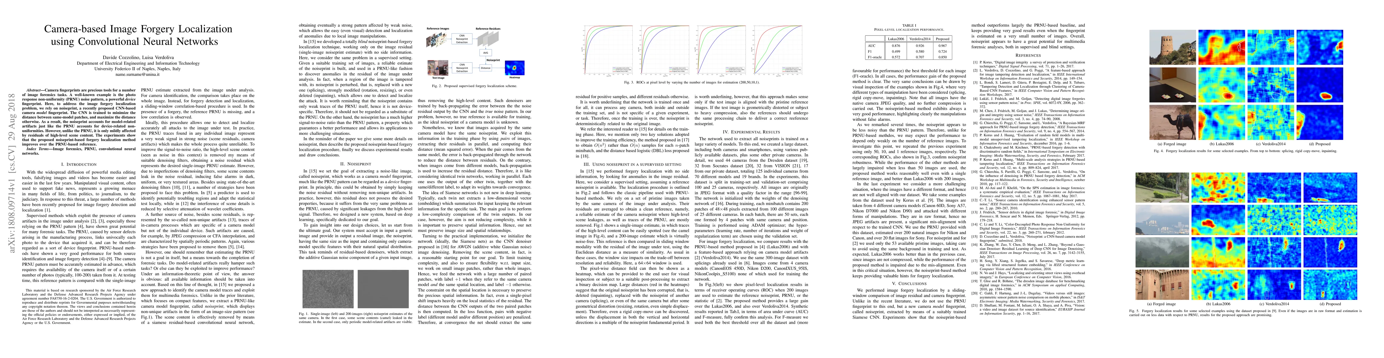 This research paper proposes a convolutional neural network (CNN)-based method called noiseprint for camera-based image forgery localization. Unlike traditional photo response non-uniformity (PRNU) noise patterns, noiseprint is less influenced by high-level scene content, leading to improved forgery detection. The CNN is trained to distinguish between patches from the same camera model, enhancing the method's effectiveness in identifying image forgeries.