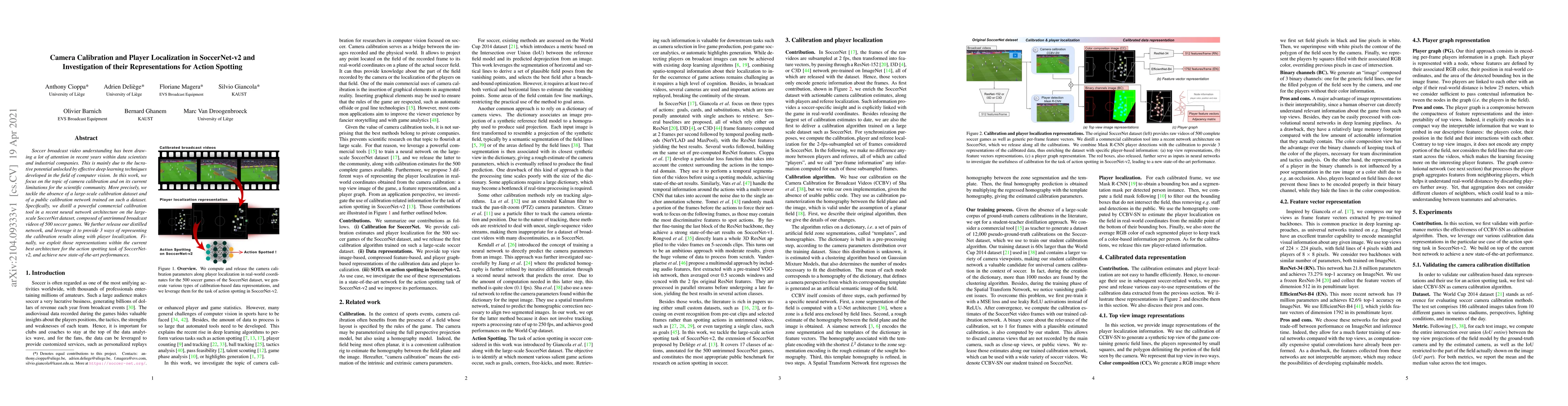 This paper addresses the lack of camera calibration datasets and networks in soccer video analysis, distilling a commercial calibration tool into a neural network on SoccerNet-v2. It introduces three calibration representations and player localization methods, achieving state-of-the-art performance in action spotting.