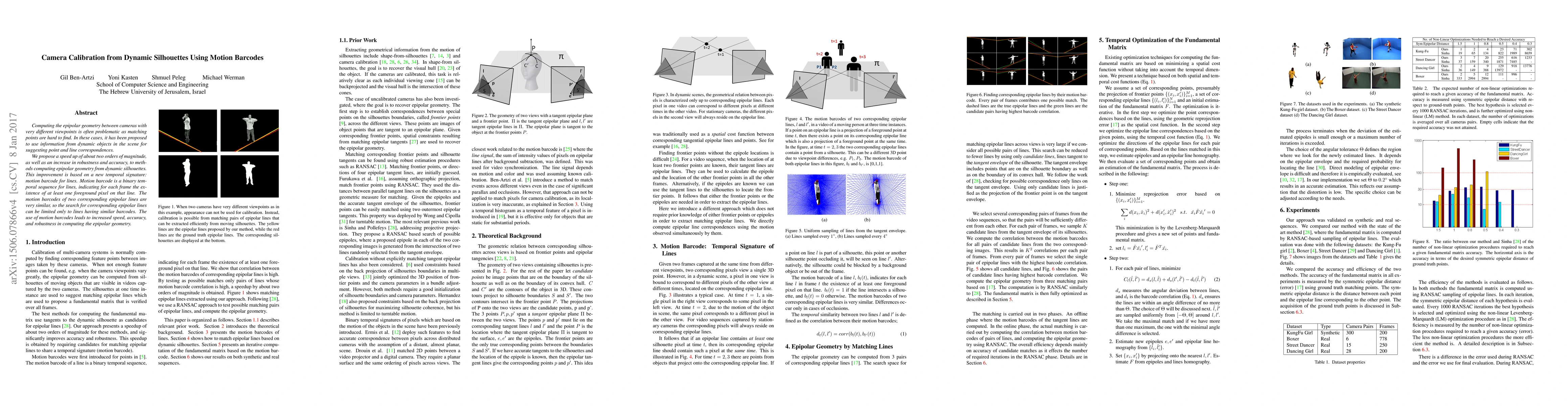 Computing the epipolar geometry between cameras with very different viewpoints is often problematic as matching points are hard to find. In these cases, it has been proposed to use information from dynamic objects in the scene for suggesting point and line correspondences. We propose a speed up of about two orders of magnitude, as well as an increase in robustness and accuracy, to methods computing epipolar geometry from dynamic silhouettes. This improvement is based on a new temporal signature: motion barcode for lines. Motion barcode is a binary temporal sequence for lines, indicating for each frame the existence of at least one foreground pixel on that line. The motion barcodes of two corresponding epipolar lines are very similar, so the search for corresponding epipolar lines can be limited only to lines having similar barcodes. The use of motion barcodes leads to increased speed, accuracy, and robustness in computing the epipolar geometry.
