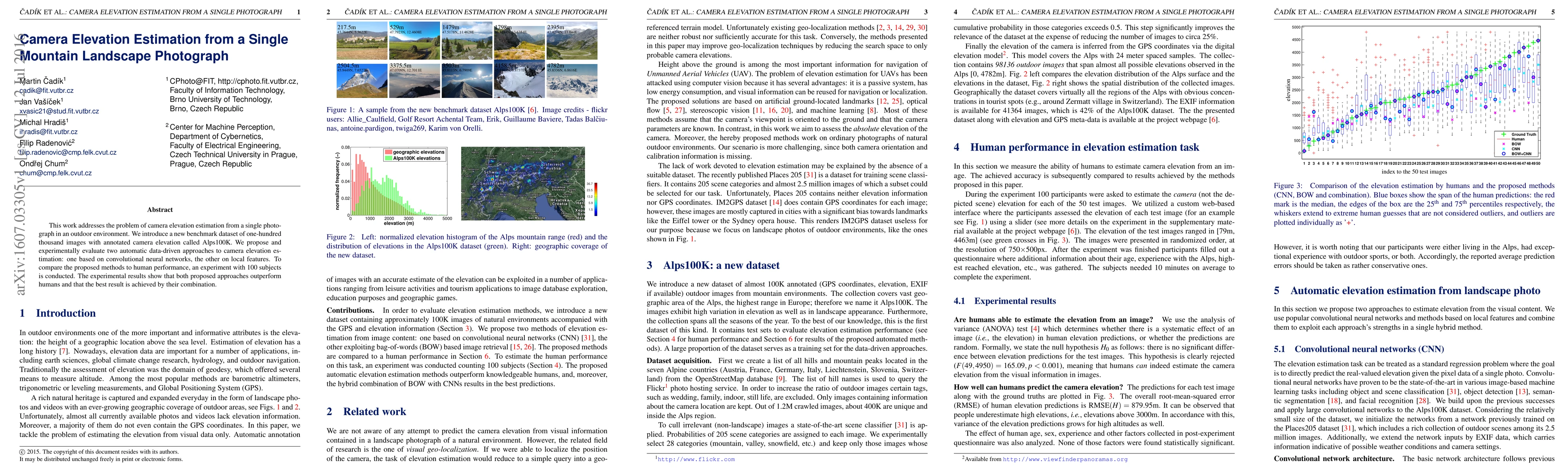 This paper introduces a new dataset, Alps100K, for estimating camera elevation from single mountain landscape photographs and proposes two data-driven methods: one using convolutional neural networks and the other based on local features. Both methods outperform human estimation, with the best results achieved by combining both approaches.
