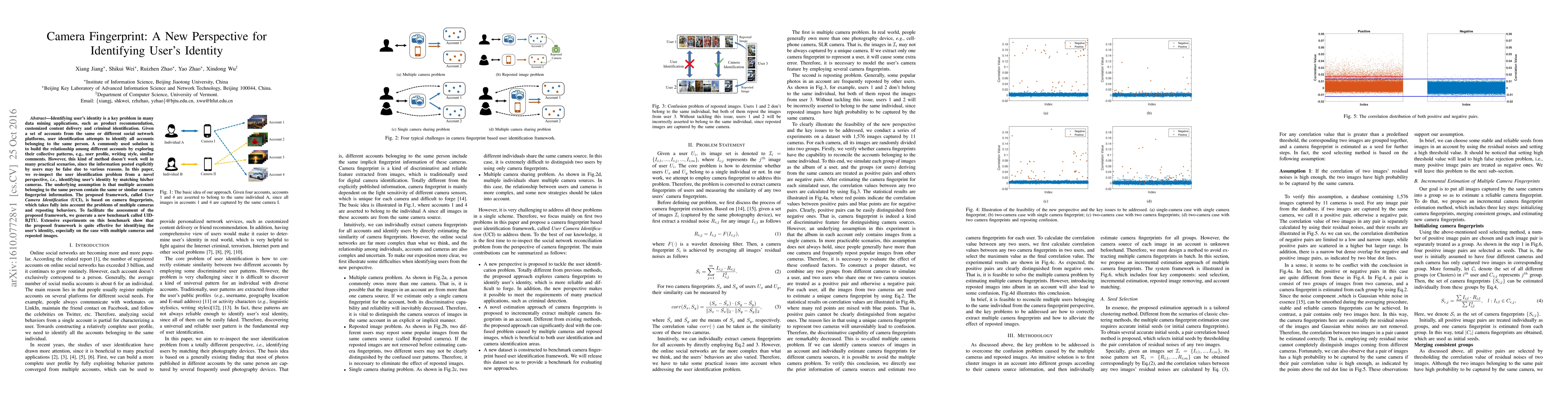 Identifying user's identity is a key problem in many data mining applications, such as product recommendation, customized content delivery and criminal identification. Given a set of accounts from the same or different social network platforms, user identification attempts to identify all accounts belonging to the same person. A commonly used solution is to build the relationship among different accounts by exploring their collective patterns, e.g., user profile, writing style, similar comments. However, this kind of method doesn't work well in many practical scenarios, since the information posted explicitly by users may be false due to various reasons. In this paper, we re-inspect the user identification problem from a novel perspective, i.e., identifying user's identity by matching his/her cameras. The underlying assumption is that multiple accounts belonging to the same person contain the same or similar camera fingerprint information. The proposed framework, called User Camera Identification (UCI), is based on camera fingerprints, which takes fully into account the problems of multiple cameras and reposting behaviors.