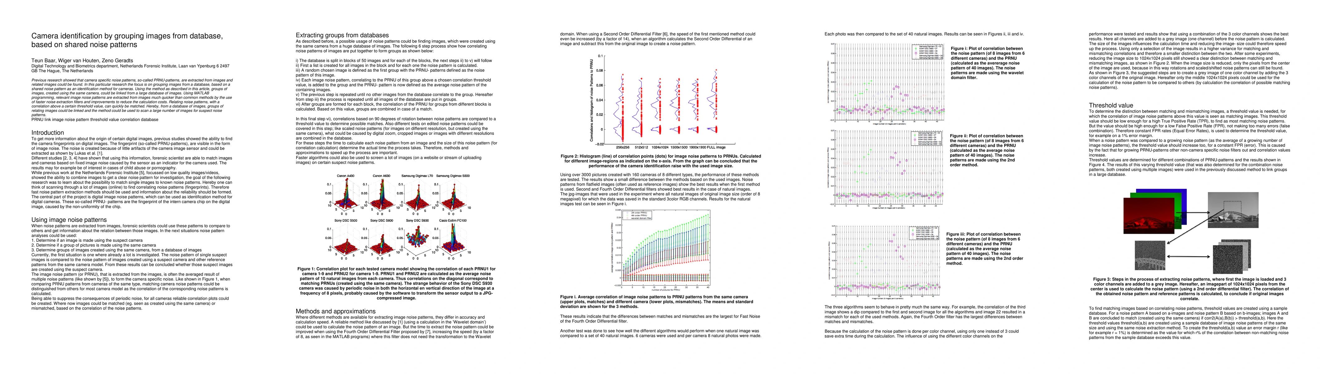 Previous research showed that camera specific noise patterns, so-called PRNU-patterns, are extracted from images and related images could be found. In this particular research the focus is on grouping images from a database, based on a shared noise pattern as an identification method for cameras. Using the method as described in this article, groups of images, created using the same camera, could be linked from a large database of images. Using MATLAB programming, relevant image noise patterns are extracted from images much quicker than common methods by the use of faster noise extraction filters and improvements to reduce the calculation costs. Relating noise patterns, with a correlation above a certain threshold value, can quickly be matched. Hereby, from a database of images, groups of relating images could be linked and the method could be used to scan a large number of images for suspect noise patterns.