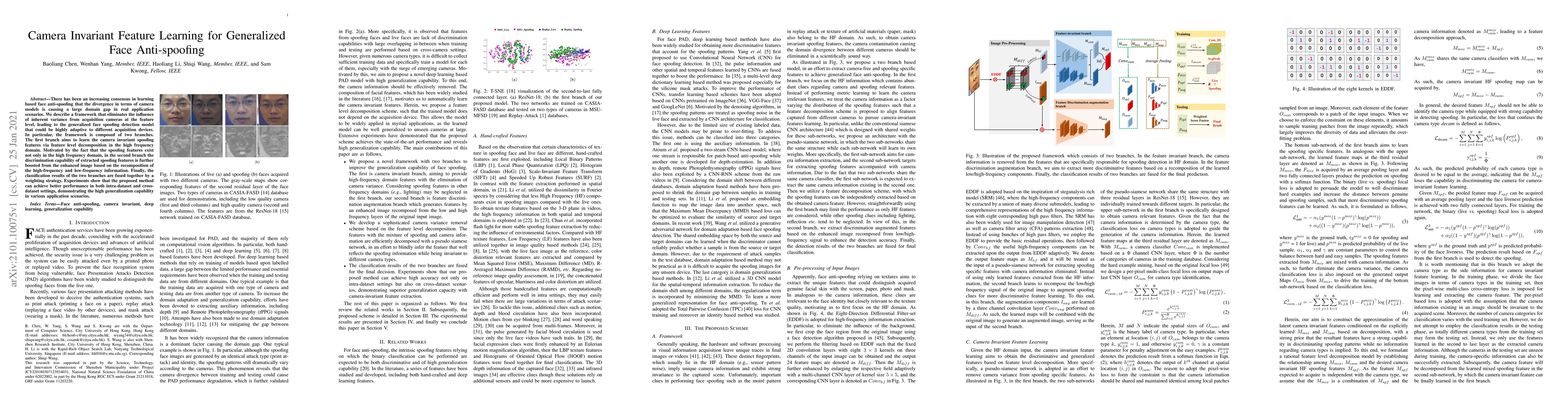 This paper proposes a framework for generalized face anti-spoofing that addresses the domain gap caused by camera model variance through camera invariant feature learning. The method employs two branches to extract and enhance spoofing features, achieving better performance in both intra-dataset and cross-dataset scenarios.