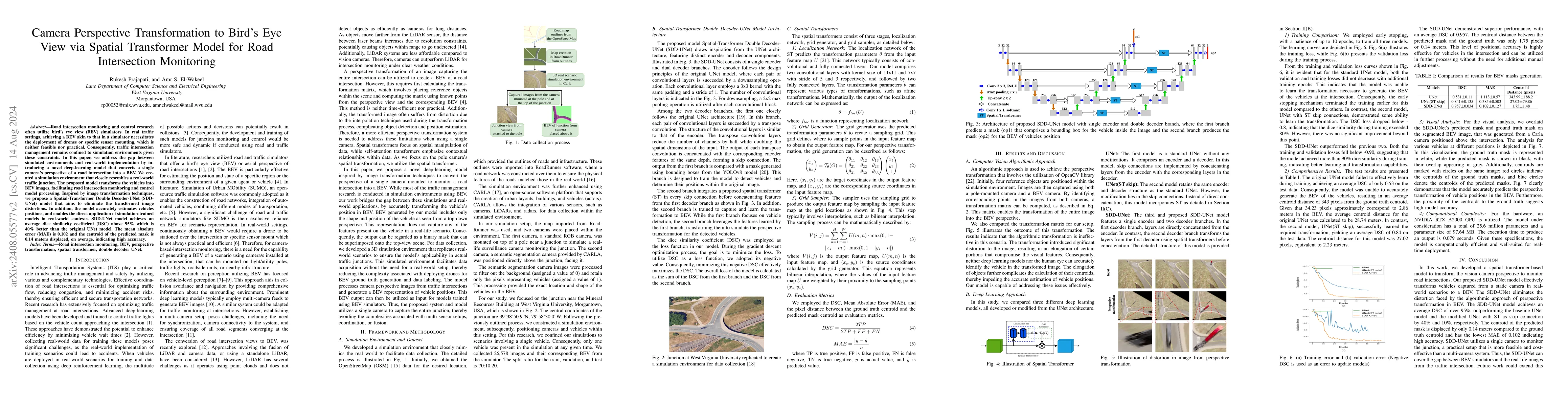 Road intersection monitoring and control research often utilize bird's eye view (BEV) simulators. In real traffic settings, achieving a BEV akin to that in a simulator necessitates the deployment of drones or specific sensor mounting, which is neither feasible nor practical. Consequently, traffic intersection management remains confined to simulation environments given these constraints. In this paper, we address the gap between simulated environments and real-world implementation by introducing a novel deep-learning model that converts a single camera's perspective of a road intersection into a BEV. We created a simulation environment that closely resembles a real-world traffic junction. The proposed model transforms the vehicles into BEV images, facilitating road intersection monitoring and control model processing. Inspired by image transformation techniques, we propose a Spatial-Transformer Double Decoder-UNet (SDD-UNet) model that aims to eliminate the transformed image distortions. In addition, the model accurately estimates the vehicle's positions and enables the direct application of simulation-trained models in real-world contexts. SDD-UNet model achieves an average dice similarity coefficient (DSC) above 95% which is 40% better than the original UNet model. The mean absolute error (MAE) is 0.102 and the centroid of the predicted mask is 0.14 meters displaced, on average, indicating high accuracy.