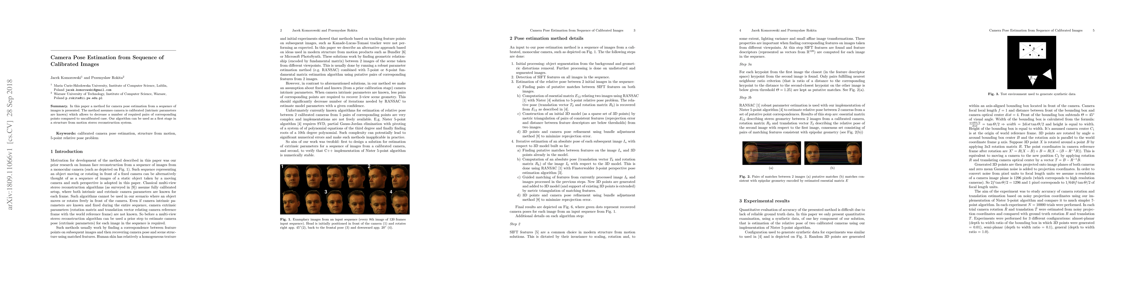 A method for camera pose estimation from a sequence of calibrated images is presented, using fewer pairs of corresponding points than uncalibrated cases, to aid in stereo reconstruction systems.