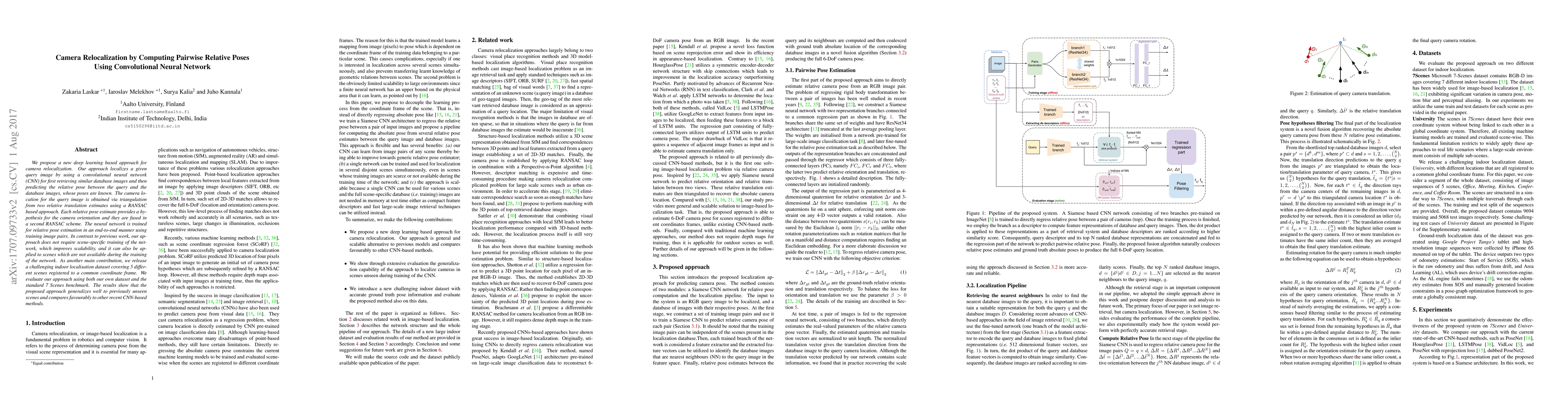 A new deep learning approach for camera relocalization uses a convolutional neural network to predict relative poses between query images and database images, achieving good generalization and comparison to other methods.