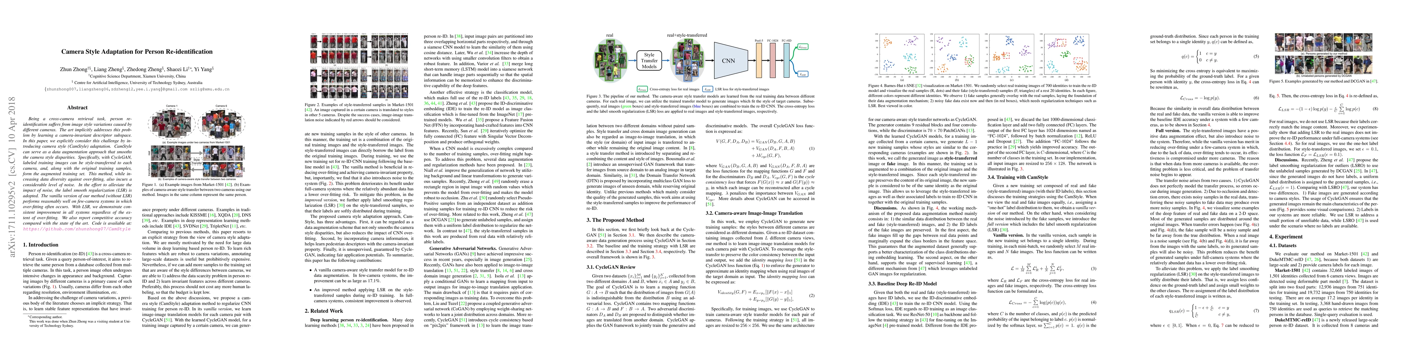 Being a cross-camera retrieval task, person re-identification suffers from image style variations caused by different cameras. The art implicitly addresses this problem by learning a camera-invariant descriptor subspace. In this paper, we explicitly consider this challenge by introducing camera style (CamStyle) adaptation. CamStyle can serve as a data augmentation approach that smooths the camera style disparities. Specifically, with CycleGAN, labeled training images can be style-transferred to each camera, and, along with the original training samples, form the augmented training set. This method, while increasing data diversity against over-fitting, also incurs a considerable level of noise. In the effort to alleviate the impact of noise, the label smooth regularization (LSR) is adopted. The vanilla version of our method (without LSR) performs reasonably well on few-camera systems in which over-fitting often occurs. With LSR, we demonstrate consistent improvement in all systems regardless of the extent of over-fitting. We also report competitive accuracy compared with the state of the art.