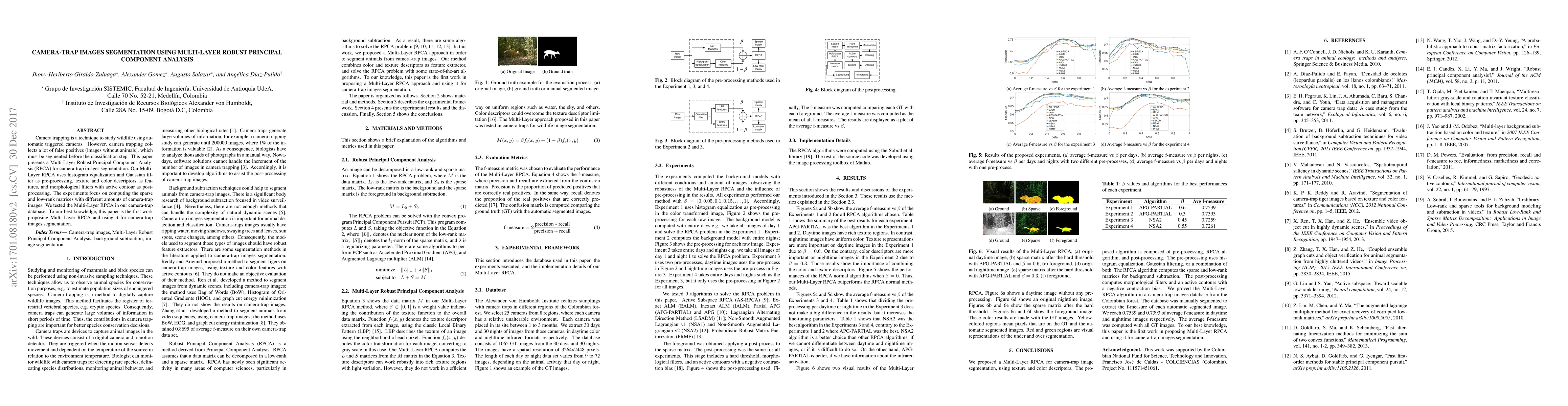 This paper proposes a multi-layer robust principal component analysis (multi-layer RPCA) approach for segmenting animals from camera-trap images, achieving superior performance compared to other background subtraction methods. The method integrates color and texture features, and is optimized using an exhaustive search.