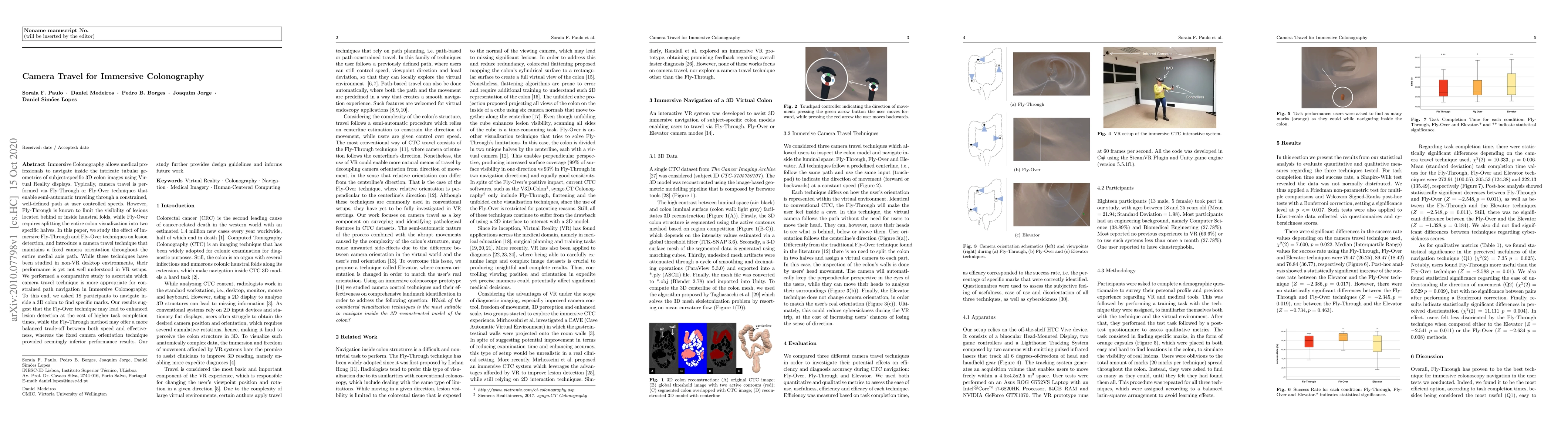 Immersive Colonography allows medical professionals to navigate inside the intricate tubular geometries of subject-specific 3D colon images using Virtual Reality displays. Typically, camera travel is performed via Fly-Through or Fly-Over techniques that enable semi-automatic traveling through a constrained, well-defined path at user controlled speeds. However, Fly-Through is known to limit the visibility of lesions located behind or inside haustral folds, while Fly-Over requires splitting the entire colon visualization into two specific halves. In this paper, we study the effect of immersive Fly-Through and Fly-Over techniques on lesion detection, and introduce a camera travel technique that maintains a fixed camera orientation throughout the entire medial axis path. While these techniques have been studied in non-VR desktop environments, their performance is yet not well understood in VR setups. We performed a comparative study to ascertain which camera travel technique is more appropriate for constrained path navigation in Immersive Colonography. To this end, we asked 18 participants to navigate inside a 3D colon to find specific marks. Our results suggest that the Fly-Over technique may lead to enhanced lesion detection at the cost of higher task completion times, while the Fly-Through method may offer a more balanced trade-off between both speed and effectiveness, whereas the fixed camera orientation technique provided seemingly inferior performance results. Our study further provides design guidelines and informs future work.