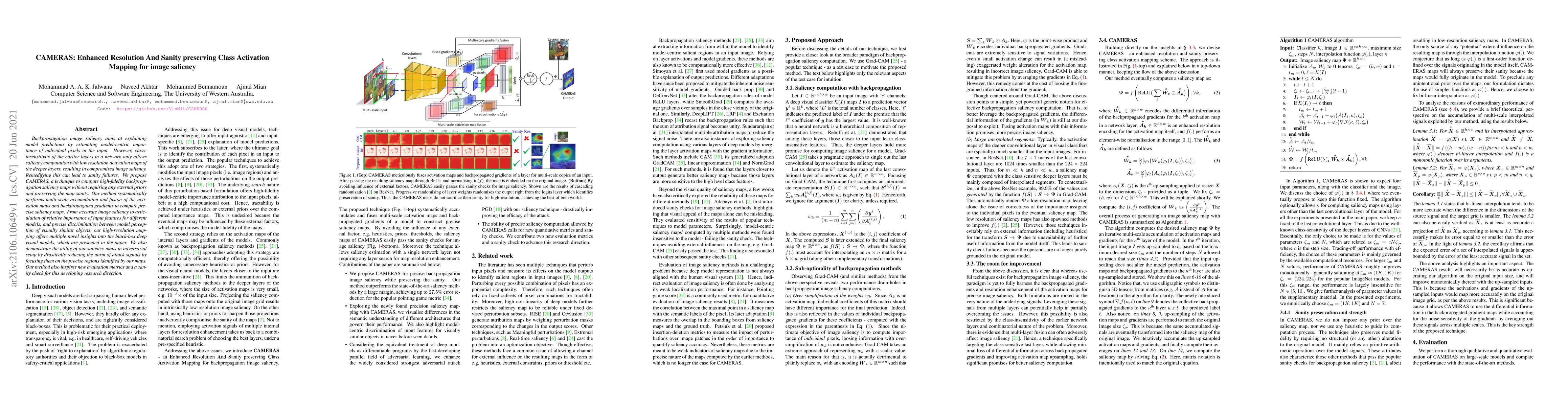 CAMERAS enhances resolution for backpropagation saliency maps, enabling high-fidelity, sanity-preserving class activation mapping without external priors. It achieves this through multi-scale accumulation and fusion, offering insights into deep visual models and reducing adversarial attack signal norms.