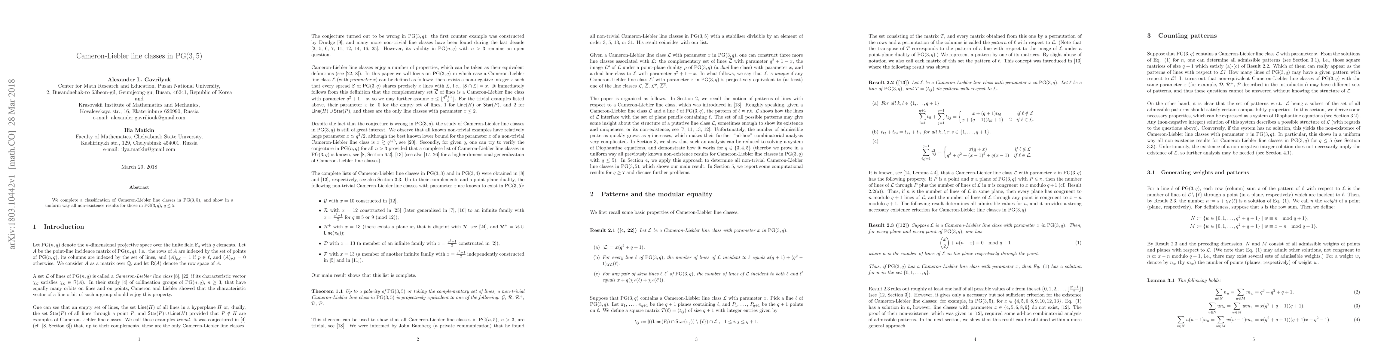 The research presents a novel approach to classifying and proving non-existence of Cameron-Liebler line classes, offering detailed solutions and proofs for specific parameters in PG(3,5) and extending previous work on non-existence results in PG(3,q) for q ≤ 5.