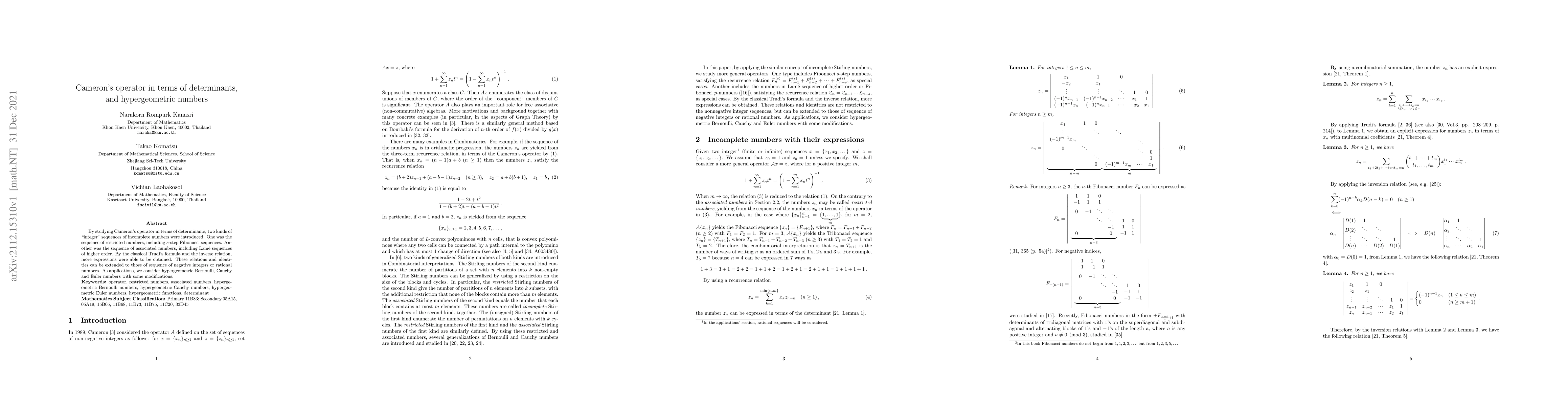 By studying Cameron's operator in terms of determinants, two kinds of "integer" sequences of incomplete numbers were introduced. One was the sequence of restricted numbers, including $s$-step Fibonacci sequences. Another was the sequence of associated numbers, including Lam\'e sequences of higher order. By the classical Trudi's formula and the inverse relation, more expressions were able to be obtained. These relations and identities can be extended to those of sequence of negative integers or rational numbers. As applications, we consider hypergeometric Bernoulli, Cauchy and Euler numbers with some modifications.