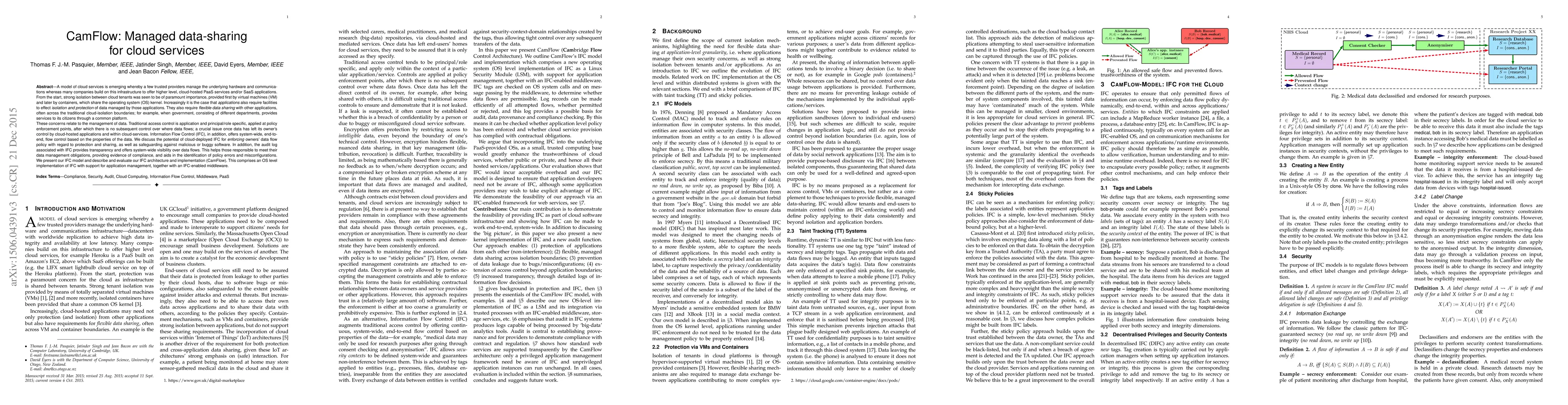 A model of cloud services is emerging whereby a few trusted providers manage the underlying hardware and communications whereas many companies build on this infrastructure to offer higher level, cloud-hosted PaaS services and/or SaaS applications. From the start, strong isolation between cloud tenants was seen to be of paramount importance, provided first by virtual machines (VM) and later by containers, which share the operating system (OS) kernel. Increasingly it is the case that applications also require facilities to effect isolation and protection of data managed by those applications. They also require flexible data sharing with other applications, often across the traditional cloud-isolation boundaries; for example, when government provides many related services for its citizens on a common platform. Similar considerations apply to the end-users of applications. But in particular, the incorporation of cloud services within `Internet of Things' architectures is driving the requirements for both protection and cross-application data sharing. These concerns relate to the management of data. Traditional access control is application and principal/role specific, applied at policy enforcement points, after which there is no subsequent control over where data flows; a crucial issue once data has left its owner's control by cloud-hosted applications and within cloud-services. Information Flow Control (IFC), in addition, offers system-wide, end-to-end, flow control based on the properties of the data. We discuss the potential of cloud-deployed IFC for enforcing owners' dataflow policy with regard to protection and sharing, as well as safeguarding against malicious or buggy software. In addition, the audit log associated with IFC provides transparency, giving configurable system-wide visibility over data flows. [...]
