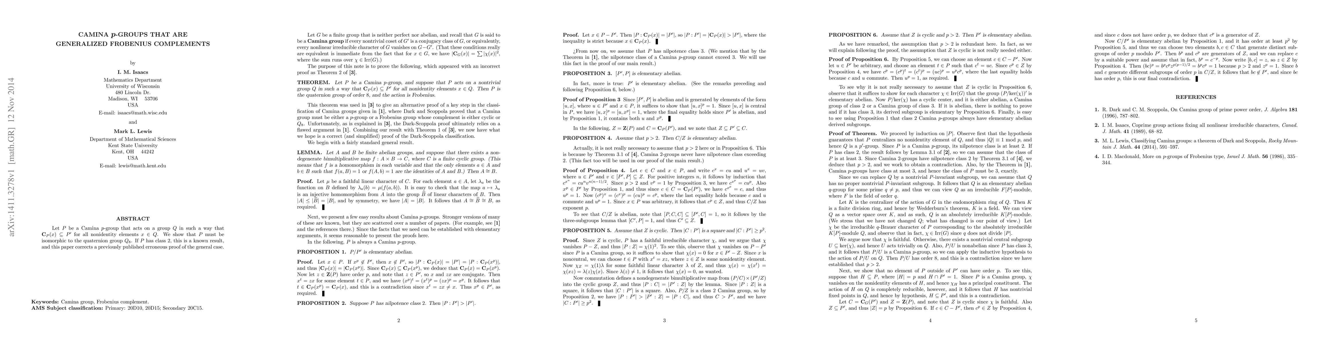 Let $P$ be a Camina $p$-group that acts on a group $Q$ in such a way that $C_P (x) \subseteq P'$ for all nonidentity elements $x \in Q$. We show that $P$ must be isomorphic to the quaternion group $Q_8$. If $P$ has class $2$, this is a known result, and this paper corrects a previously published erroneous proof of the general case.
