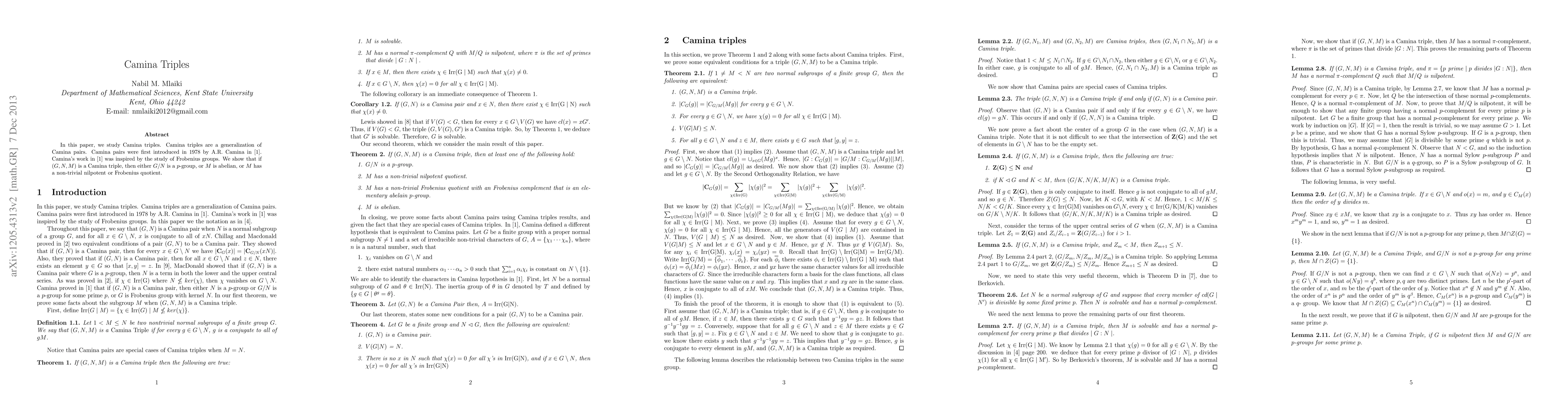 In this paper, we study Camina triples. Camina triples are a generalization of Camina pairs. Camina pairs were first introduced in 1978 by A.R. Camina in \cite{camina1}. Camina's work in \cite{camina1} was inspired by the study of Frobenius groups. We show that if $(G,N,M)$ is a Camina triple, then either $G/N$ is a $p$-group, $M$ is nilpotent, or $M$ has a non-trivial nilpotent quotient.