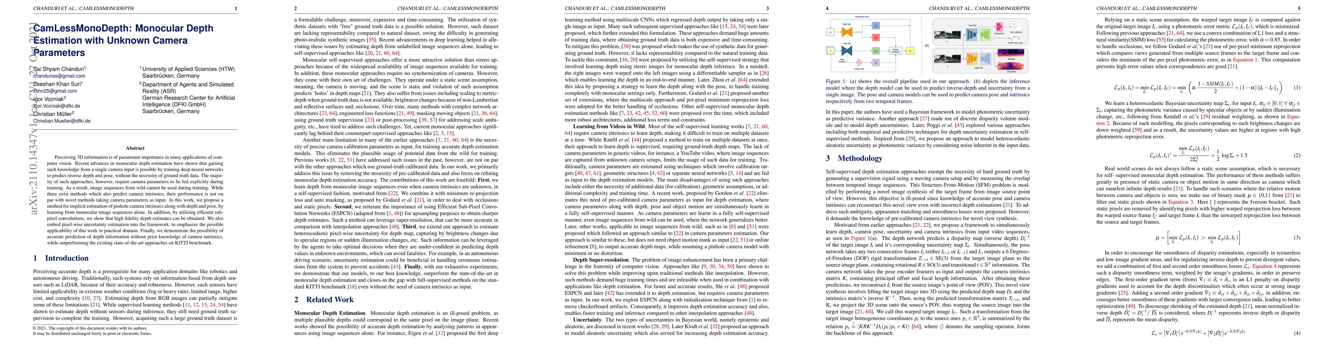 Perceiving 3D information is of paramount importance in many applications of computer vision. Recent advances in monocular depth estimation have shown that gaining such knowledge from a single camera input is possible by training deep neural networks to predict inverse depth and pose, without the necessity of ground truth data. The majority of such approaches, however, require camera parameters to be fed explicitly during training. As a result, image sequences from wild cannot be used during training. While there exist methods which also predict camera intrinsics, their performance is not on par with novel methods taking camera parameters as input. In this work, we propose a method for implicit estimation of pinhole camera intrinsics along with depth and pose, by learning from monocular image sequences alone. In addition, by utilizing efficient sub-pixel convolutions, we show that high fidelity depth estimates can be obtained. We also embed pixel-wise uncertainty estimation into the framework, to emphasize the possible applicability of this work in practical domain. Finally, we demonstrate the possibility of accurate prediction of depth information without prior knowledge of camera intrinsics, while outperforming the existing state-of-the-art approaches on KITTI benchmark.