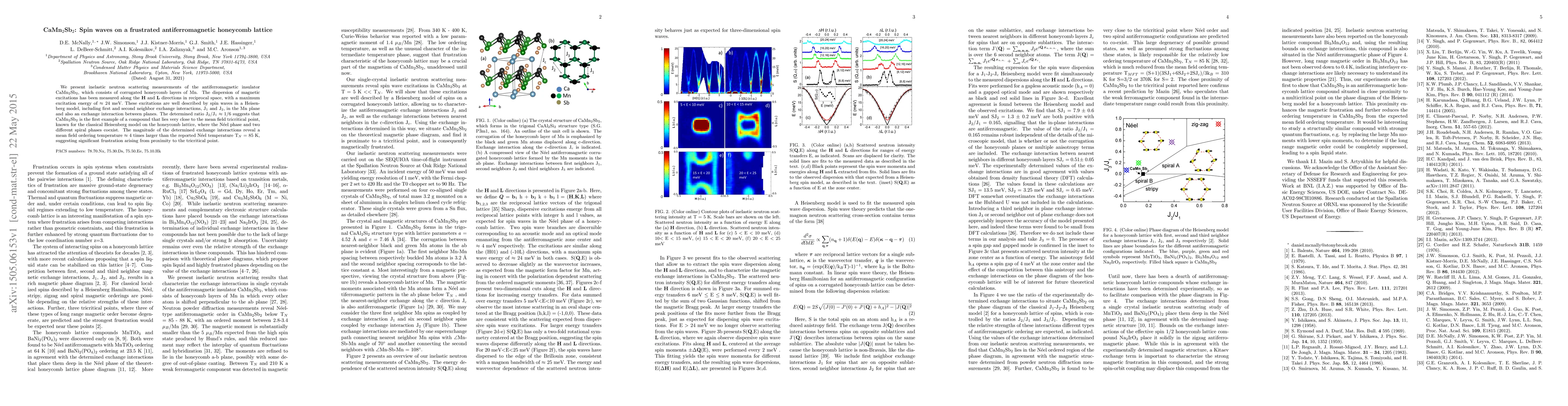 Inelastic neutron scattering reveals spin waves in CaMn$_2$Sb$_2$, a frustrated antiferromagnetic insulator with Mn honeycomb layers, showing a J$_{2}$/J$_{1}$ ratio of 1/6 near the tricritical point where multiple magnetic phases coexist. The determined exchange interactions suggest a much higher mean field ordering temperature compared to the reported N\'eel temperature.