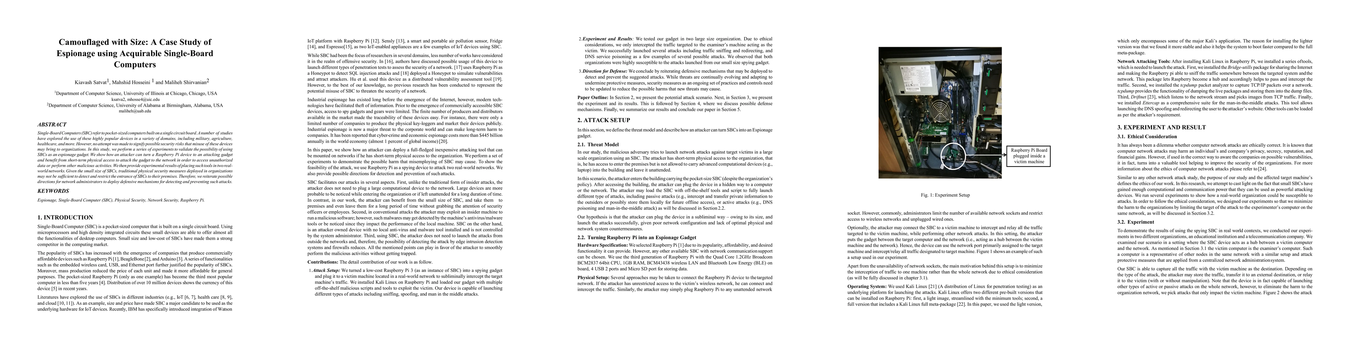 Single-Board Computers (SBC) refer to pocket-sized computers built on a single circuit board. A number of studies have explored the use of these highly popular devices in a variety of domains, including military, agriculture, healthcare, and more. However, no attempt was made to signify possible security risks that misuse of these devices may bring to organizations. In this study, we perform a series of experiments to validate the possibility of using SBCs as an espionage gadget. We show how an attacker can turn a Raspberry Pi device to an attacking gadget and benefit from short-term physical access to attach the gadget to the network in order to access unauthorized data or perform other malicious activities. We then provide experimental results of placing such tools in two real-world networks. Given the small size of SBCs, traditional physical security measures deployed in organizations may not be sufficient to detect and restrict the entrance of SBCs to their premises. Therefore, we reiterate possible directions for network administrators to deploy defensive mechanisms for detecting and preventing such attacks.